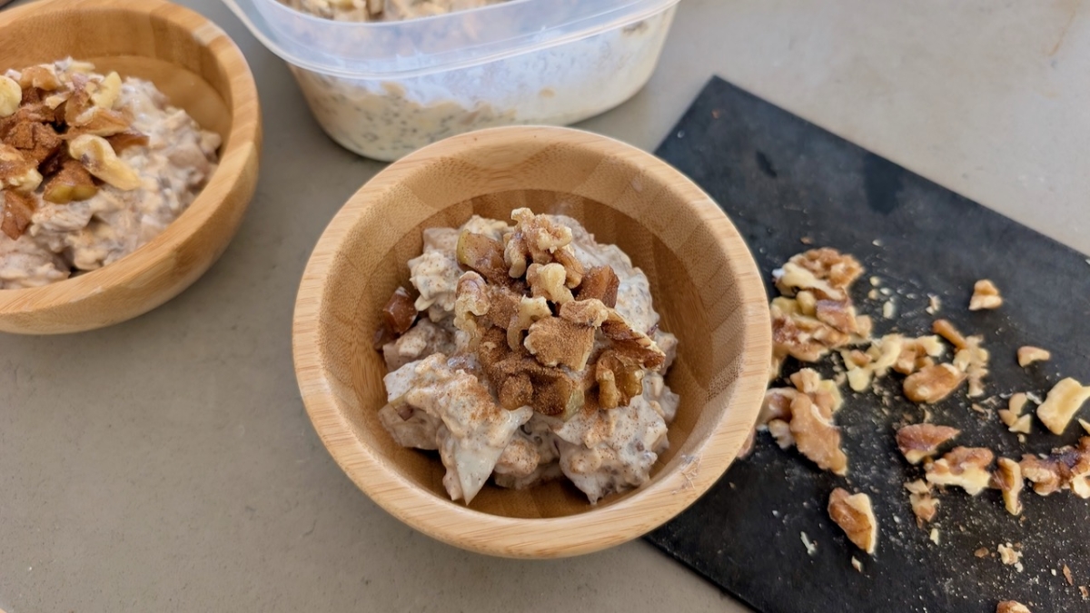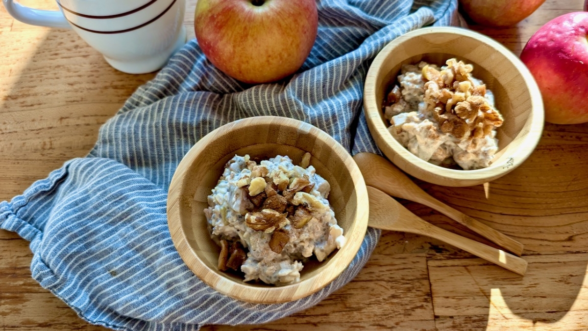 冷ましたリンゴを加え(トッピング用に少し取っておく)、全体をよく混ぜ合わせる。ラップをして一晩冷蔵庫で寝かせる。 - 翌朝、好みで牛乳を加えて柔らかさを調整し、器に盛る。くるみやシナモン、取っておいたリンゴをトッピングして完成。