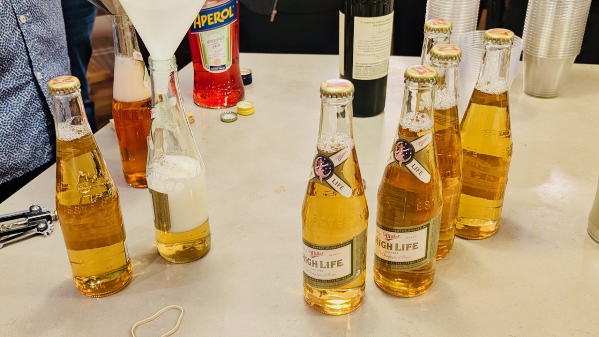 レトロなMiller High Life の瓶ビールを使うとオシャレ感が増しますが、手に入らなければ、ライトなラガービールで代用しても十分です。