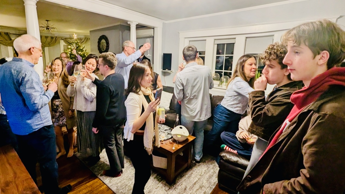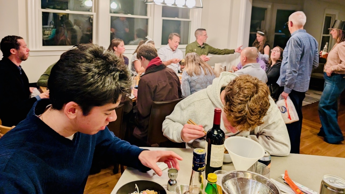 私のご近所でも、大晦日に今回で5回目となる恒例のプログレッシブディナーを行いました。今回、私が担当したのは2軒あるメイン料理のひとつで、選んだのはラーメン。中学生から70代まで、40人近くが集まり、皆がワイワイと飲み、話に花を咲かせている間に、ご近所の奥さまたちに助けてもらいながら、麺をゆで、スープを注ぎ、具材をのせて次々と仕上げていきます。