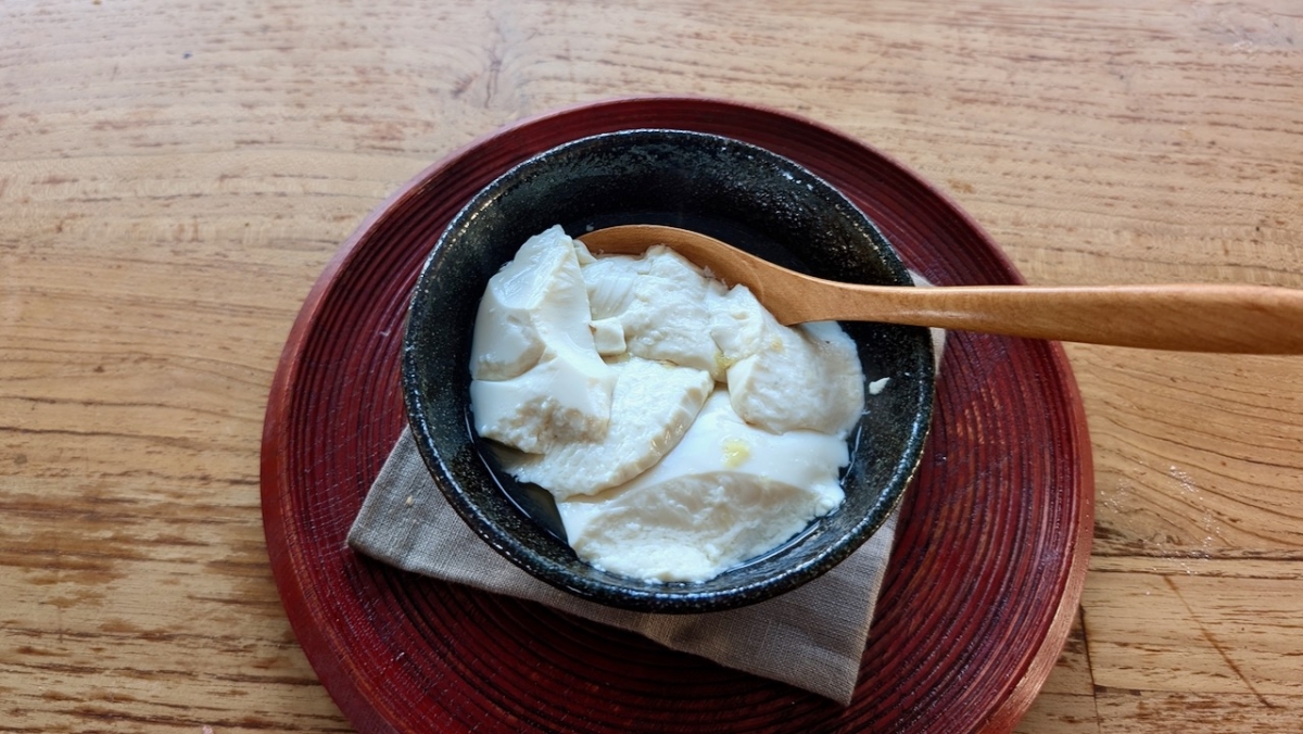 - 豆腐の表面をスプーンで薄く削ぐように、食べたい分量だけすくって、耐熱性のある器に盛る。ラップをせずに、2分ほど電子レンジで温める。豆腐を押さえて水を切ったら、温かいシロップをたっぷりかけて、いただく。