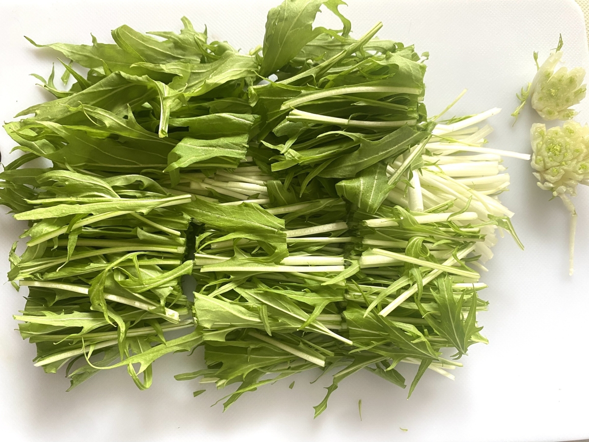 2. 水菜を洗い、3から4センチの長さに、タコは小さめにカットする。