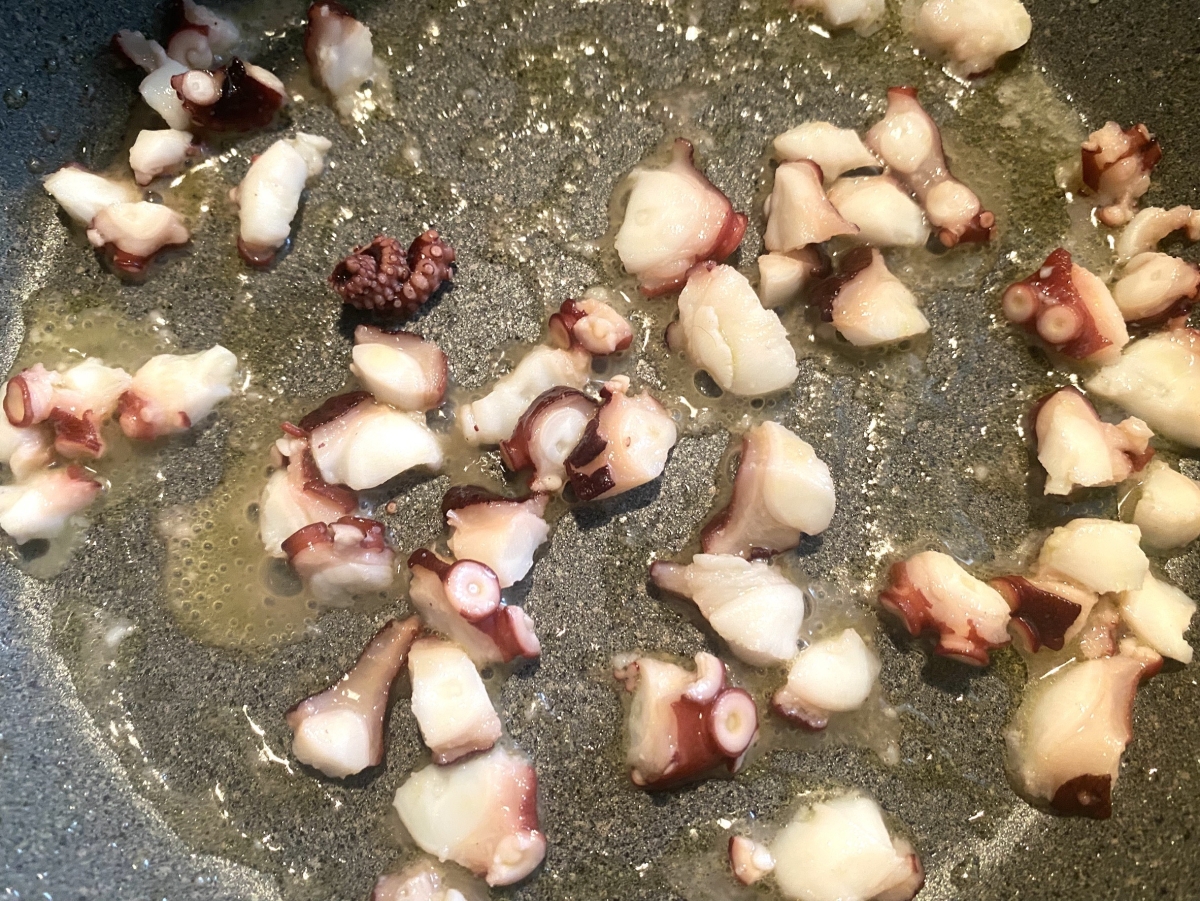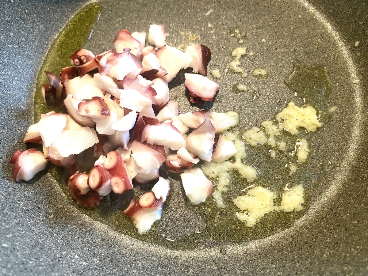 3. フライパンにオリーブオイルを入れて、にんにくとタコを炒める。