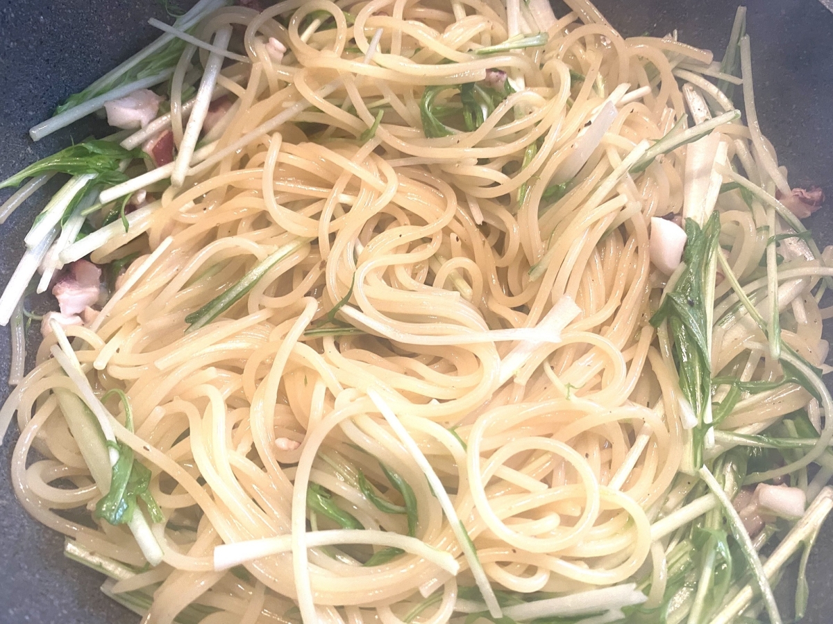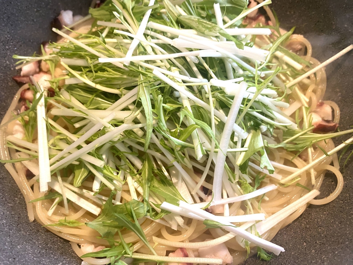 5. 茹でたパスタを水菜の茎の部分を入れて、強火で素早く混ぜ、汁をからませる。