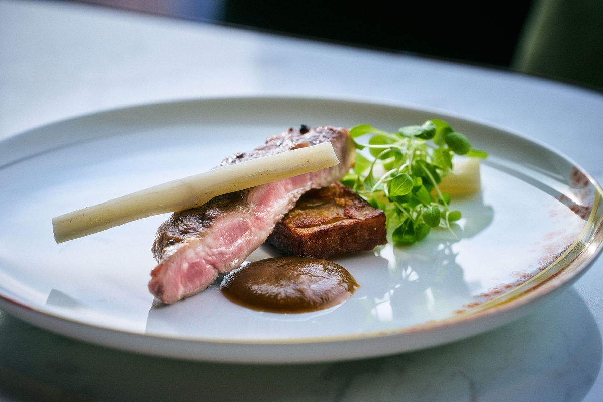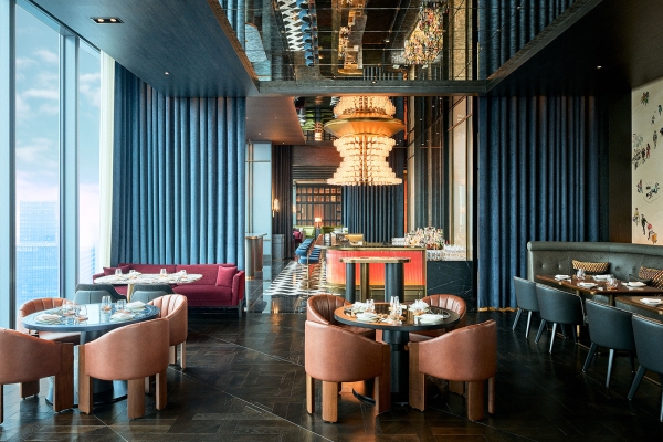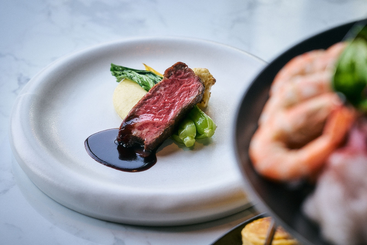 料理のテーマは「SURF&TURF(サーフ&ターフ)」。最初に登場するのは、ポーチシュリンプや蛤のスチームなど、旬の魚介を盛り込んだシグネチャー・シーフードプラッター。二段目には、ずわい蟹ケーキや、雲丹を添えたクランペットなど、和と洋の感性が交差する一品が。また、柚子やかんずり、福神漬けを使ったソースも並び、魚介をディップして召し上がれ。