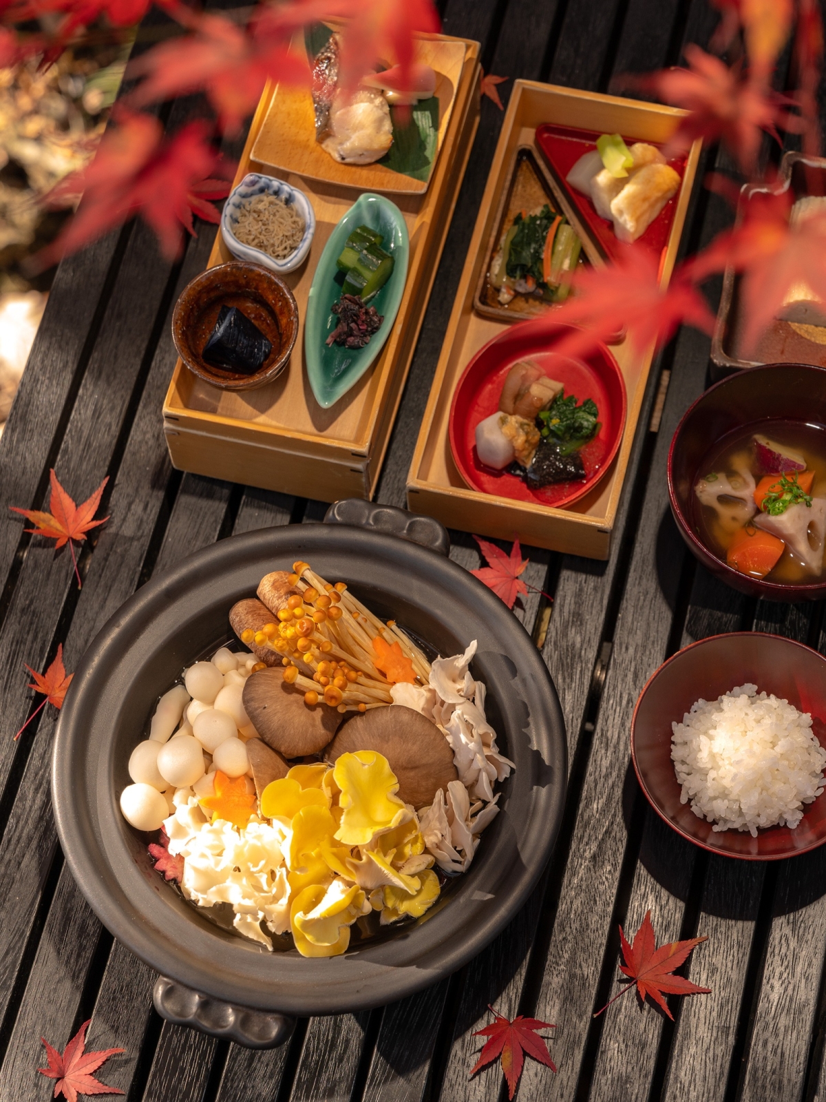 翌朝のメインダイニング・日本料理 嘉助での「山の朝食」ではきのこをはじめとする旬の食材をたっぷりと堪能。日ごろ頭を使い過ぎていて、脳が疲れ気味…という人は、頭のなかがスッとクリアになって、物事をスムーズに‟感じる”ことができるように。