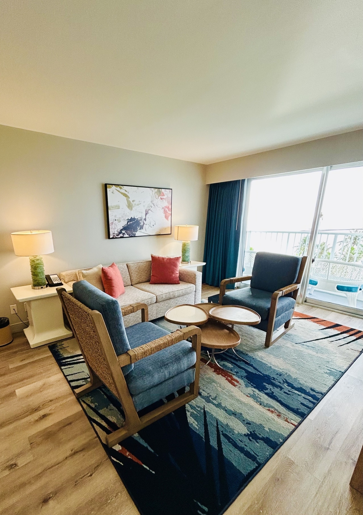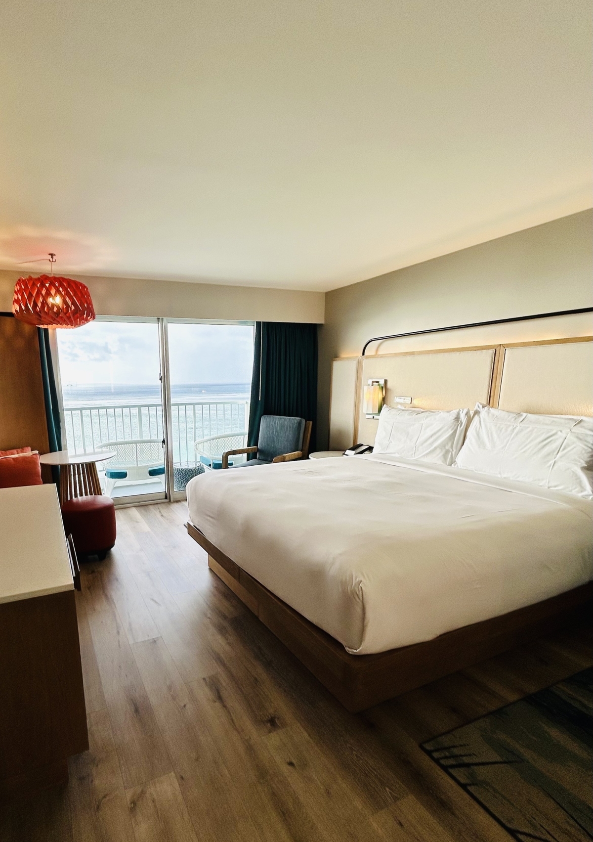 全室リノベーションされた客室内は、トロピカルな色彩と現代的な機能性が見事に調和。特におすすめしたいオーシャンフロントの客室は、大きな窓からタモンベイの絶景を堪能できて、その開放感は半端ない。一日に何度もベランダに出て、海を眺める時間を楽しみたくなるはず。