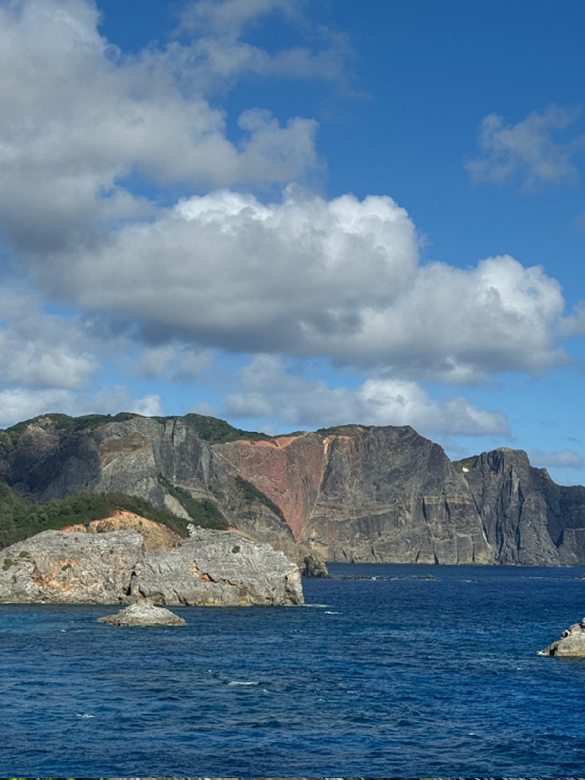 こちらは南島へ向かう途中、ボートから見えるハートロック(千尋岩)。赤土の岩肌がハート型に見えることからその名前がつかられたそうですが、父島の南端に位置する高さ約260mの断崖です。