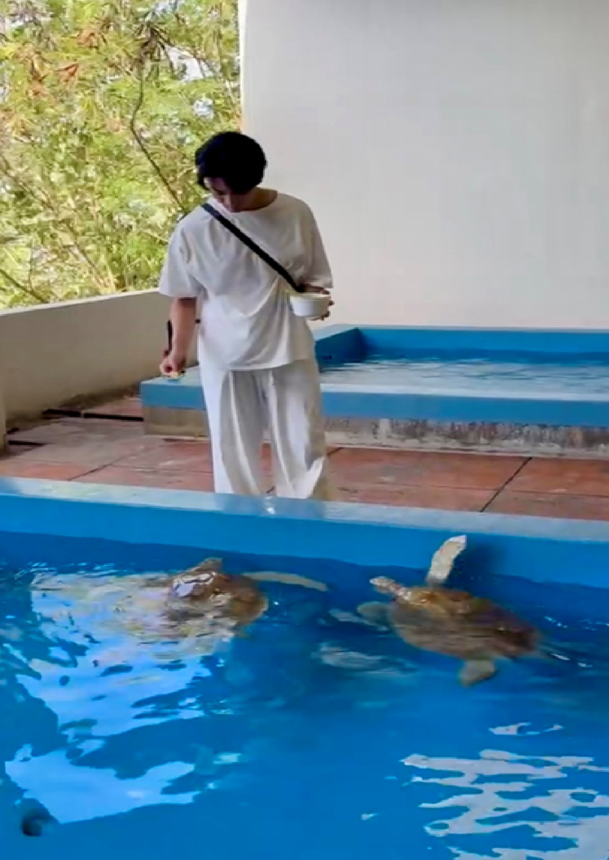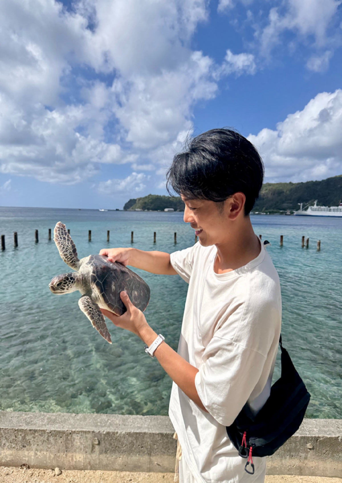 こちら父島でアオウミカメと触れ合える「小笠原海洋センター」へも足を運び、餌をあげたり、甲羅をお掃除したり、もちろんツーショットも! カメとここまで近い触れ合あったのは、初めての経験。