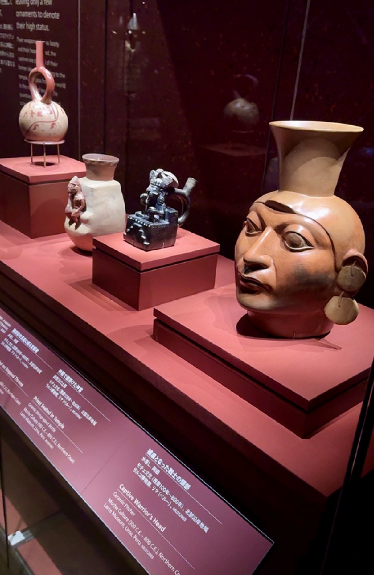 〈手前から〉「捕虜となった戦士の頭部」「神殿で腰掛けた神官」「階段状の玉座に座る支配者」「裸体の捕虜戦士の行列」 すべて@MUSEO LARCO KIMA-PERU