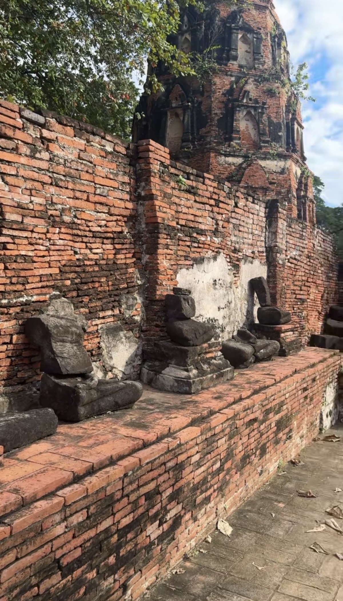 なぜ頭部と胴体が切り離されているのか? 戦いの際、信仰心の強いタイ人の戦う気力を削ぐためであったり、金箔などの装飾を獲るためといわれています。このように頭部が切り離された仏像が修復されずに残っているのは、争いの爪痕を風化させないという想いがあるのかもしれません。