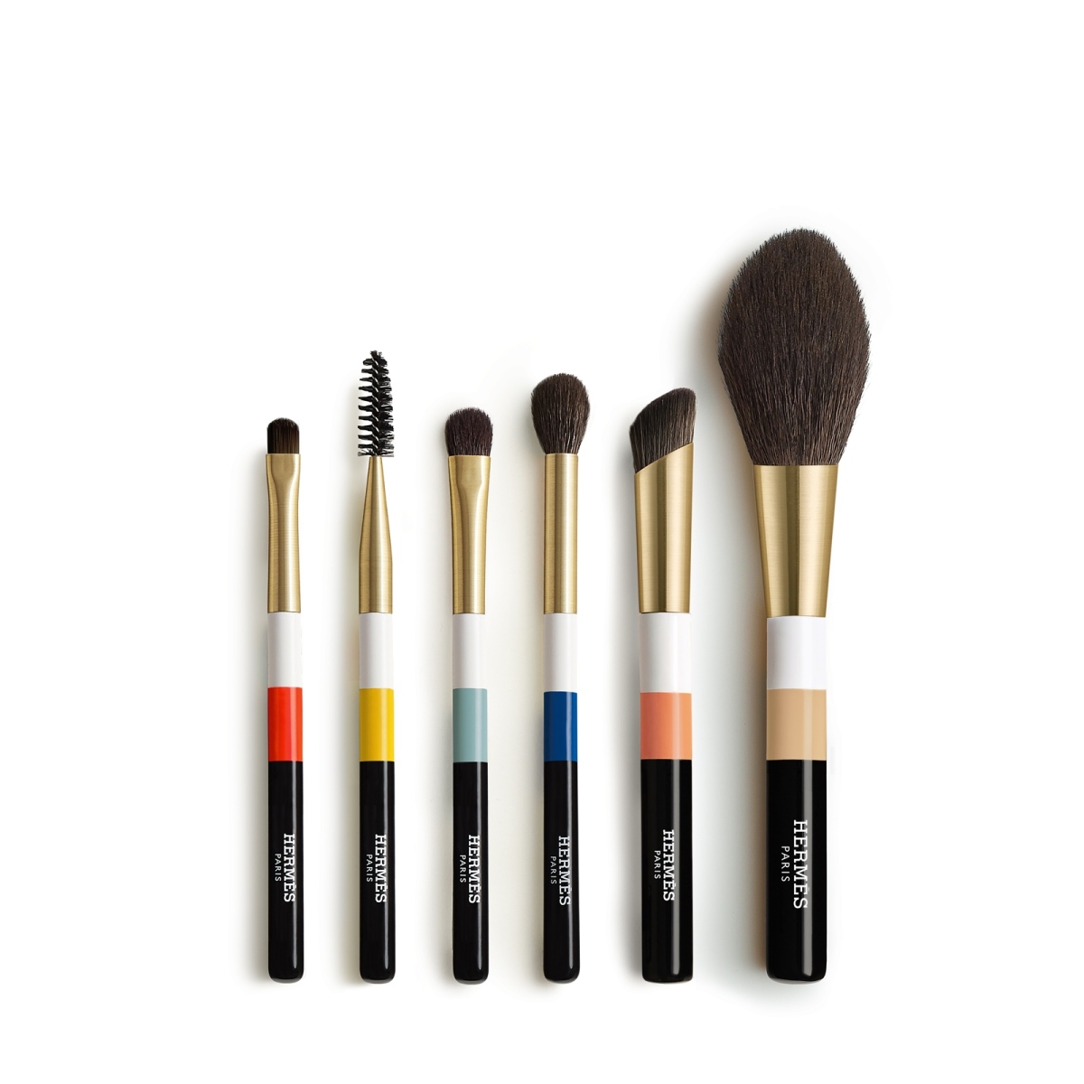 既存のブラシ「レ ヴォヤジャー」の5本に加えて新作「ル ムルチ タン」を含んだ6本のトラベルサイズのブラシセットは、持ち運びにも便利なサイズ感。木製の柄にはラッカー仕上げが施されていて、トリコロールカラーがエルメスらしい洗練を感じさせるもので、このデザインはビューティオブジェのクリエイターでもあるピエール・アルディが手がけていて、まるでアートピースのよう。