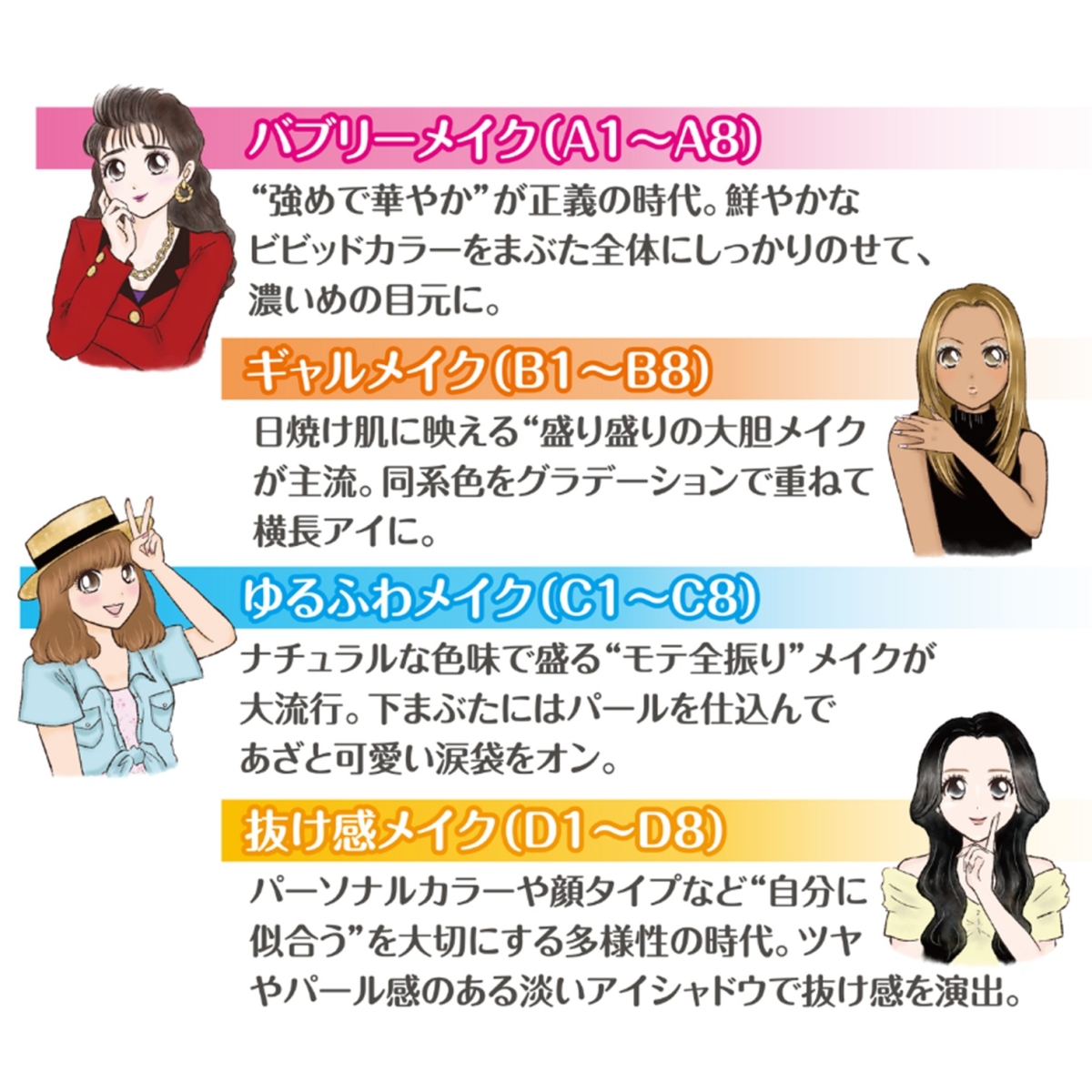 今回、昭和・平成・令和の代表するトレンドメイクの「スーパーかわいい!」が詰まったアイパレットが登場。今の気分も、レトロなメイクも自在に表現できるメモリアルな一品。