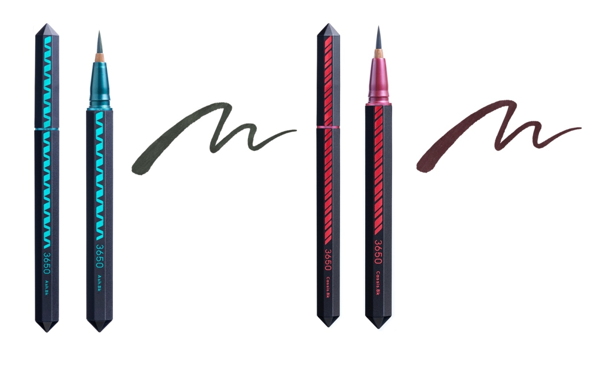 3650のリキッドアイライナー 「アッシュブラック」は彩度が低く軽やかな、透けブラック。透明感がある寒色系ブラックで瞼の影と自然に溶け合うためアイシャドウの色を選ばず目元の際を際立たせる。黒に‟カシスの赤み”を忍ばせた「カシスブラック」は、血色感と深みを両立した暗色で、ほんのり色気が宿るのに派手にならず、目元のくすみも飛ばし瞳の色を美しく引き立てる1本。