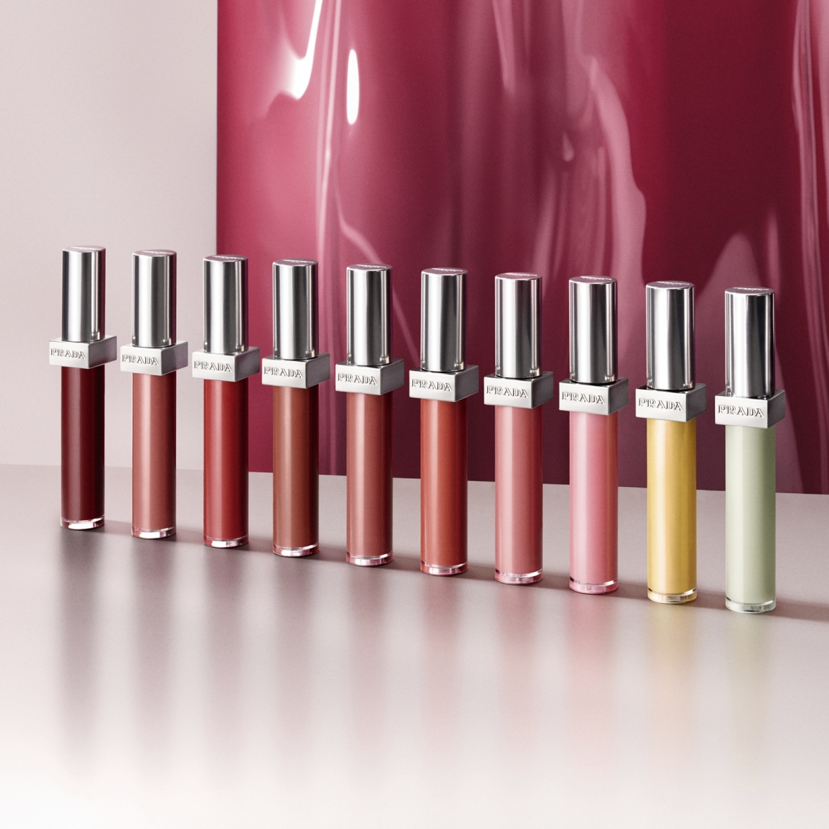 また10色すべてが日常に溶け込むカラー展開。〈P255〉の透明感ピンク、〈B201〉のヌーディブラウン、〈R221〉のブラウンレッドなど、 確実に洒落て見える色設計が秀逸。さらにクリアな2色〈U000〉の鏡のような艶、〈U002〉のゴールド×ピンクのラメ。 手持ちのリップに重ねるだけで、質感が一気に‟プラダ顔”に。
