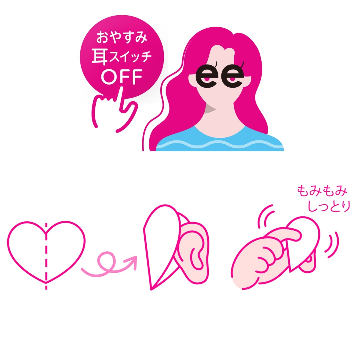 使い方は簡単! ハートパッドを折って耳を挟み込んで指先でマッサージ。「耳もみスリープパッド」と「耳もみブーストパッド」の2種類には保湿やハリ感を促す、ナイアシンアミド、ヒアルロン酸、レチノール、セラミド、ビタミンCといった美容成分がたっぷり。
