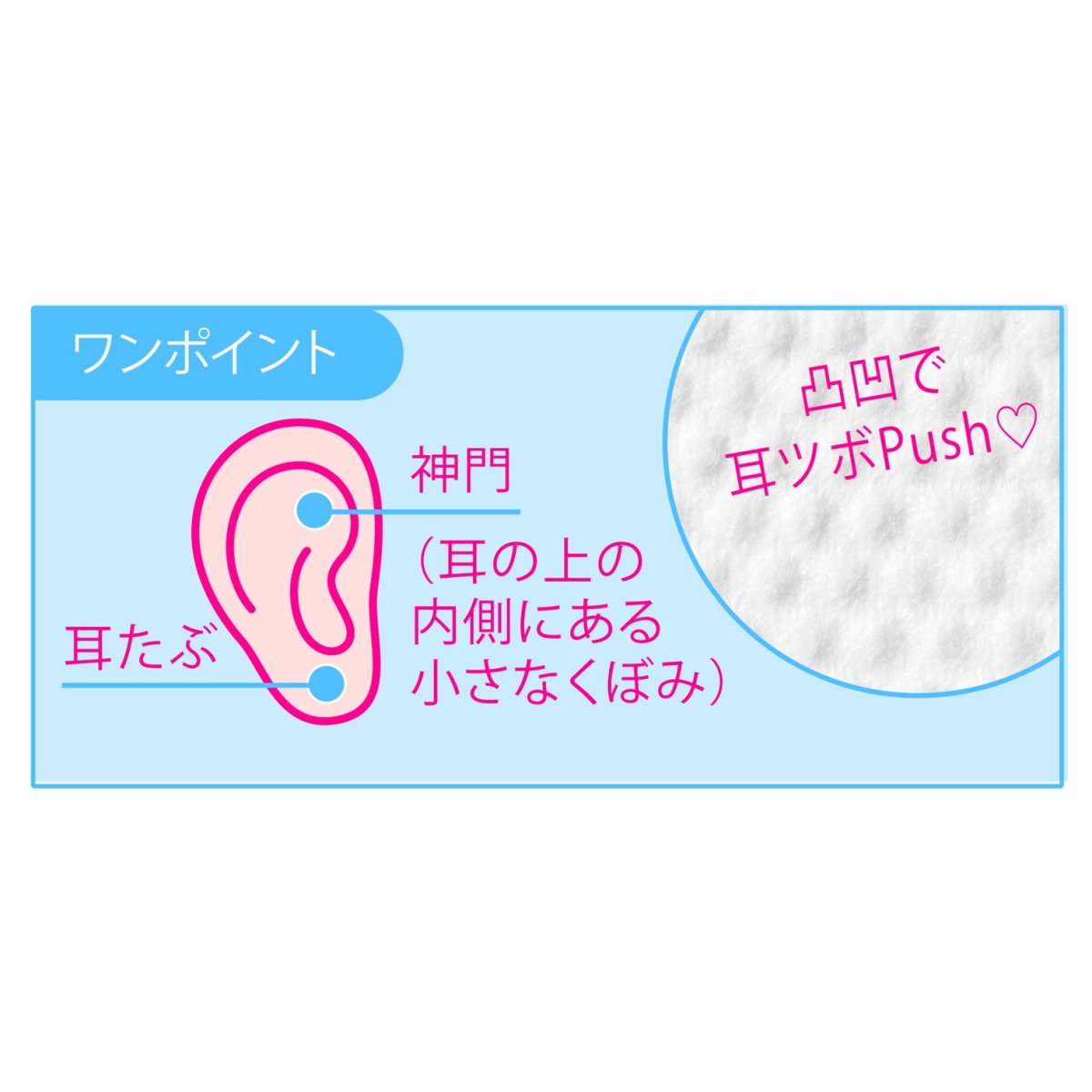 自律神経のバランスに関わる「神門」という耳ツボに、表面の凹凸部分がほどよく触れて、ソフトに刺激。「耳たぶ」をつまんでほぐすのも効果的。