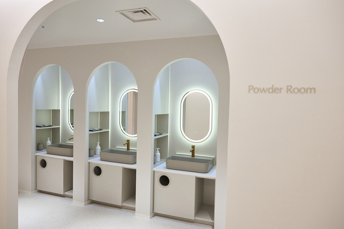 待ち時間が生じないほど十分な数が用意されたパウダールーム。パーソナルスペースも。