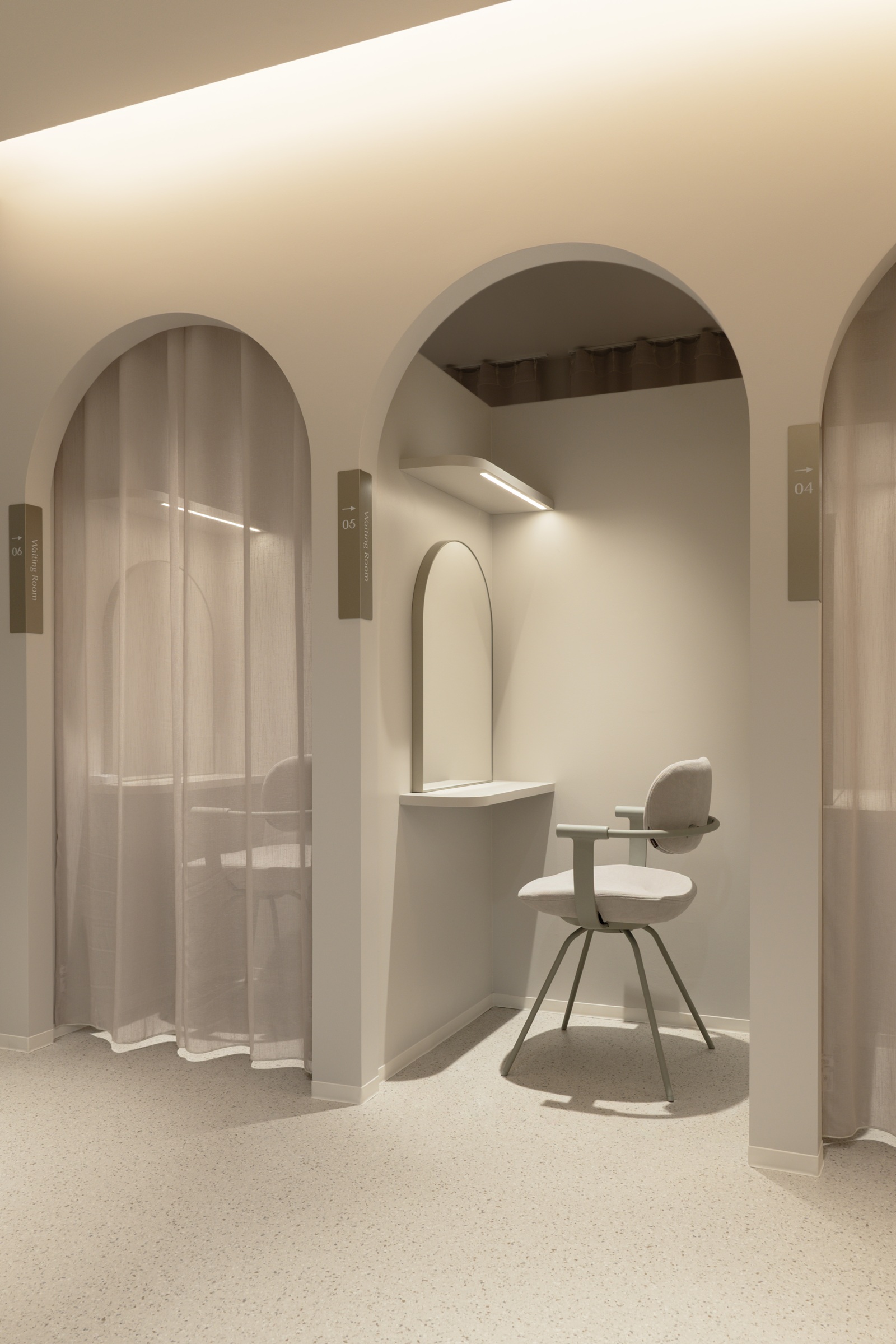柔らかな色調とアーチ形状が安心感を生む待合と麻酔準備室。半個室でプライバシーに配慮した静かな空間。