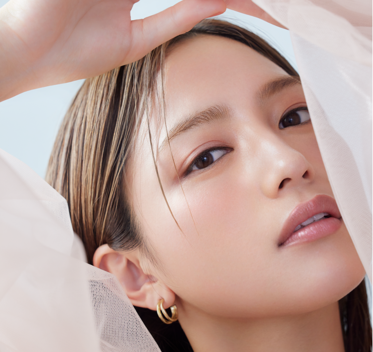 そしてシミ・くすみ・凹凸を自然にカモフラージュし、肌表面をフラットに整える。つまり、これをひと塗りするだけで、毛穴が目立ちにくいなって、頬には自然な立体感。そして、くすみが晴れたような明るさと‟光の膜”をまとったような透明感が誕生。まさに川口春奈のイメージカットどおりの肌印象へ近づけるのです。