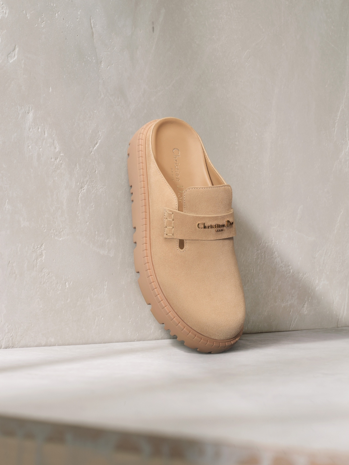 素材は上質なスエードで、ブラックとベージュで展開される。写真のオープンバックのミュールバージョンのほかに、ローヒールのバージョンも登場。フロントにゴールドのレタリングで施された “Christian Dior Paris”シグネチャーも素敵! 秋のおしゃれが楽しくなる一足、ぜひチェックして。