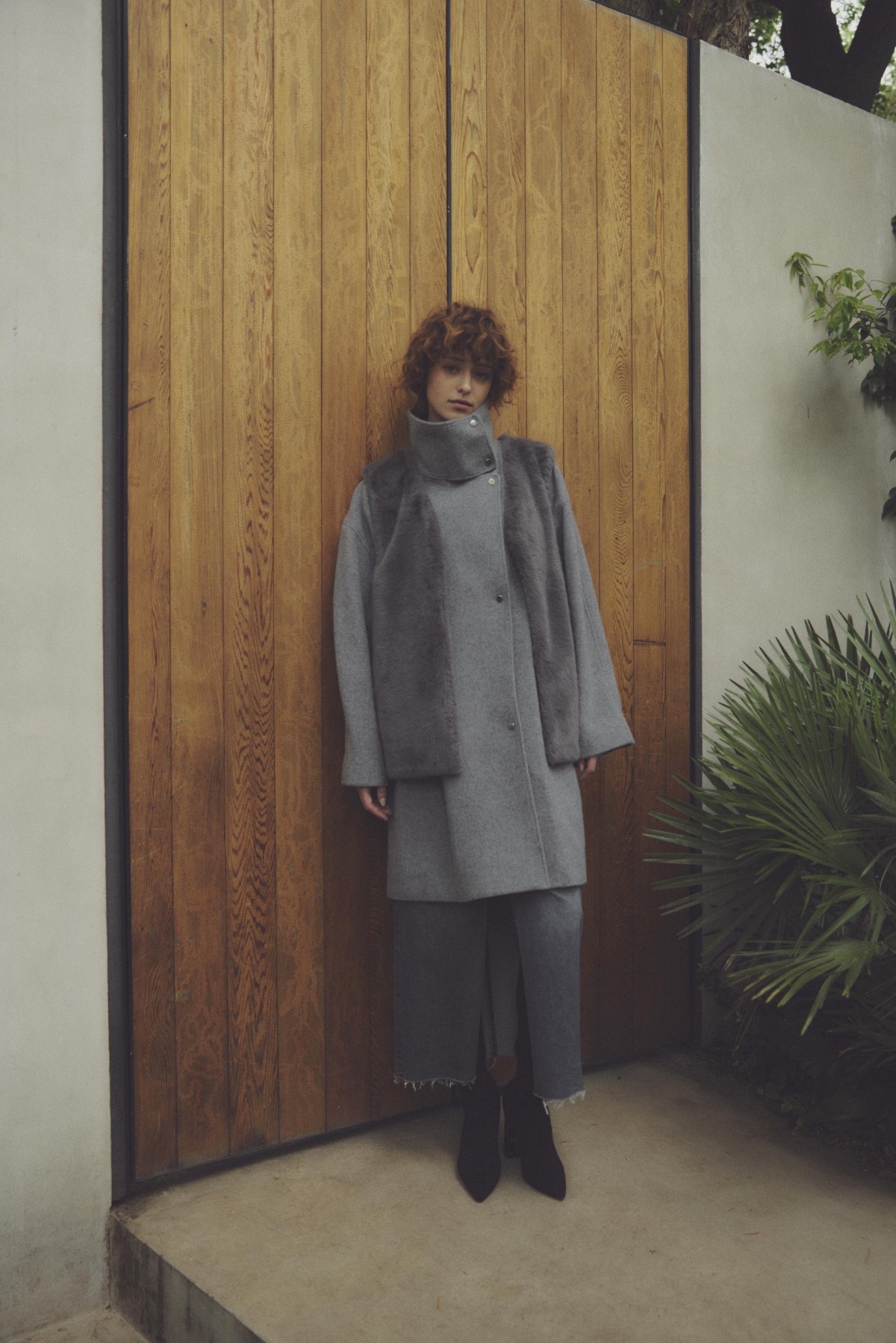 ファーライナー付きのロングコートは、ライナー単体でも着用可能。コートの上に重ねれば、スタイリングに奥行きが生まれ、冬のレイヤードがもっと楽しくなるはず。衿元を閉じれば防寒に、開ければ大きめの衿がアクセントに。素材には、オーストラリア・ジロン地方の上質な羊毛を使用。光沢と保温性に優れ、軽やかで柔らかな着心地が魅力。