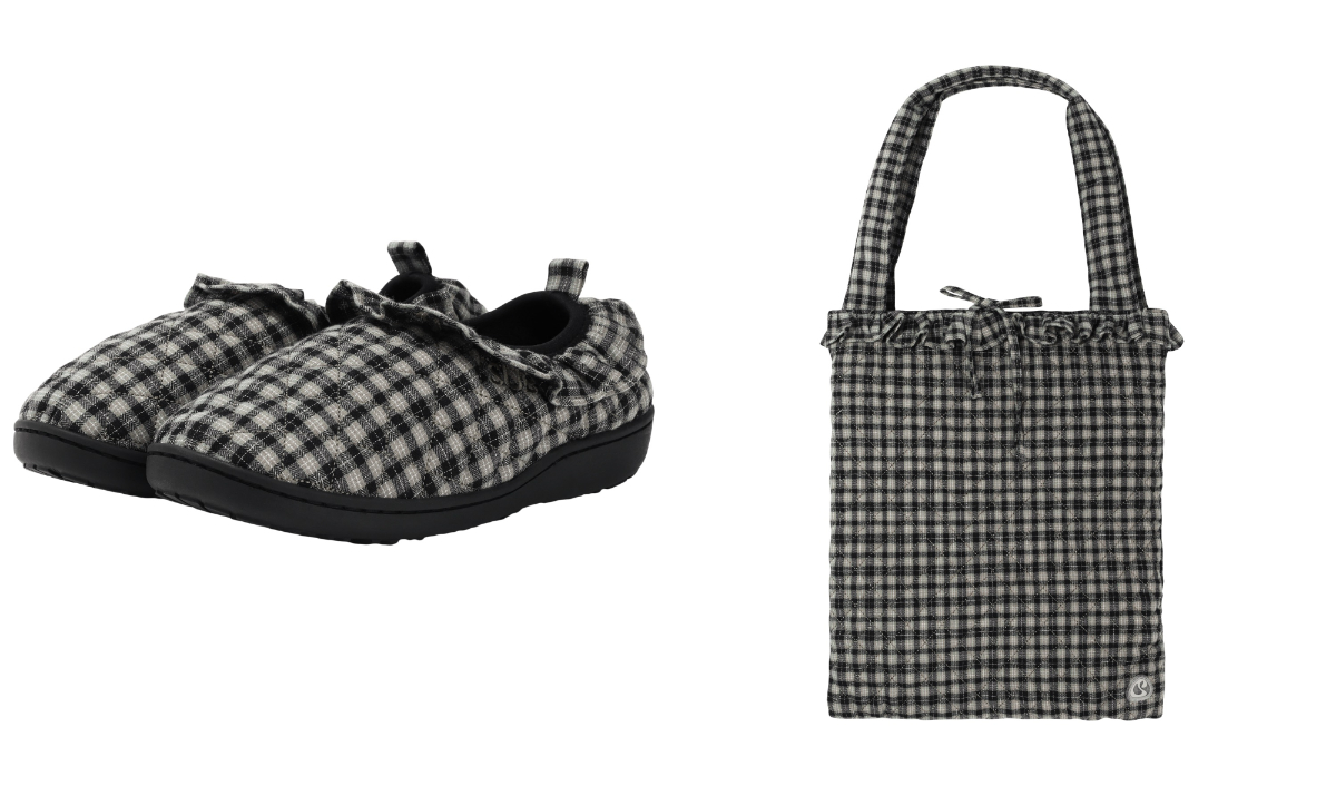 今回は、柔らかなスウェット素材にウサ耳のようなフォルムと淡いパープルの裏地をあしらった「BUNNY SWEAT PADDING SHOES」、チェック柄とフリルでガーリーなムードを演出する「FLUFF CHECK PADDING SHOES」、そして繊細なパターン生地にふんわりファーの裏地を合わせた「SNUG PADDING SHOES」の3型がラインナップ。いずれもバッグとしても使えるシューズケース付きで、リンクさせて街に繰り出したい!