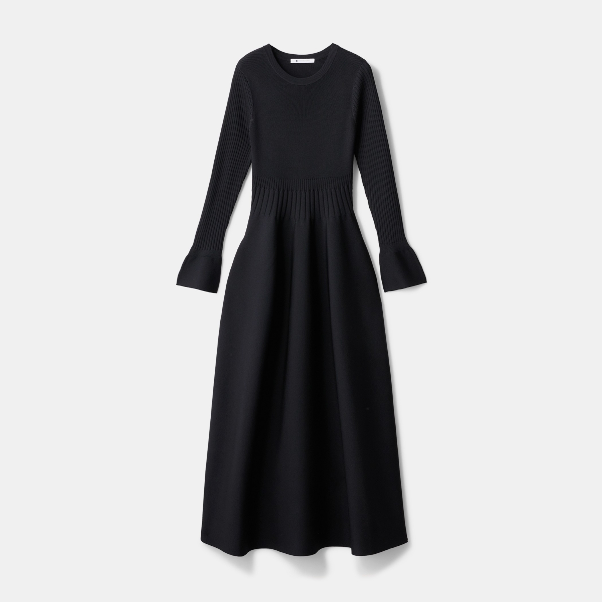 なかでもおすすめは、ニットフレアワンピース。体のラインを拾いにくい素材を使い、ウエストからふわっと広がるシルエットが美しい一着。着るだけで立ち姿がすっきり見えて、女性らしさをさりげなく引き立ててくれるデザインは、オンにもオフにも活躍してくれる万能アイテム。