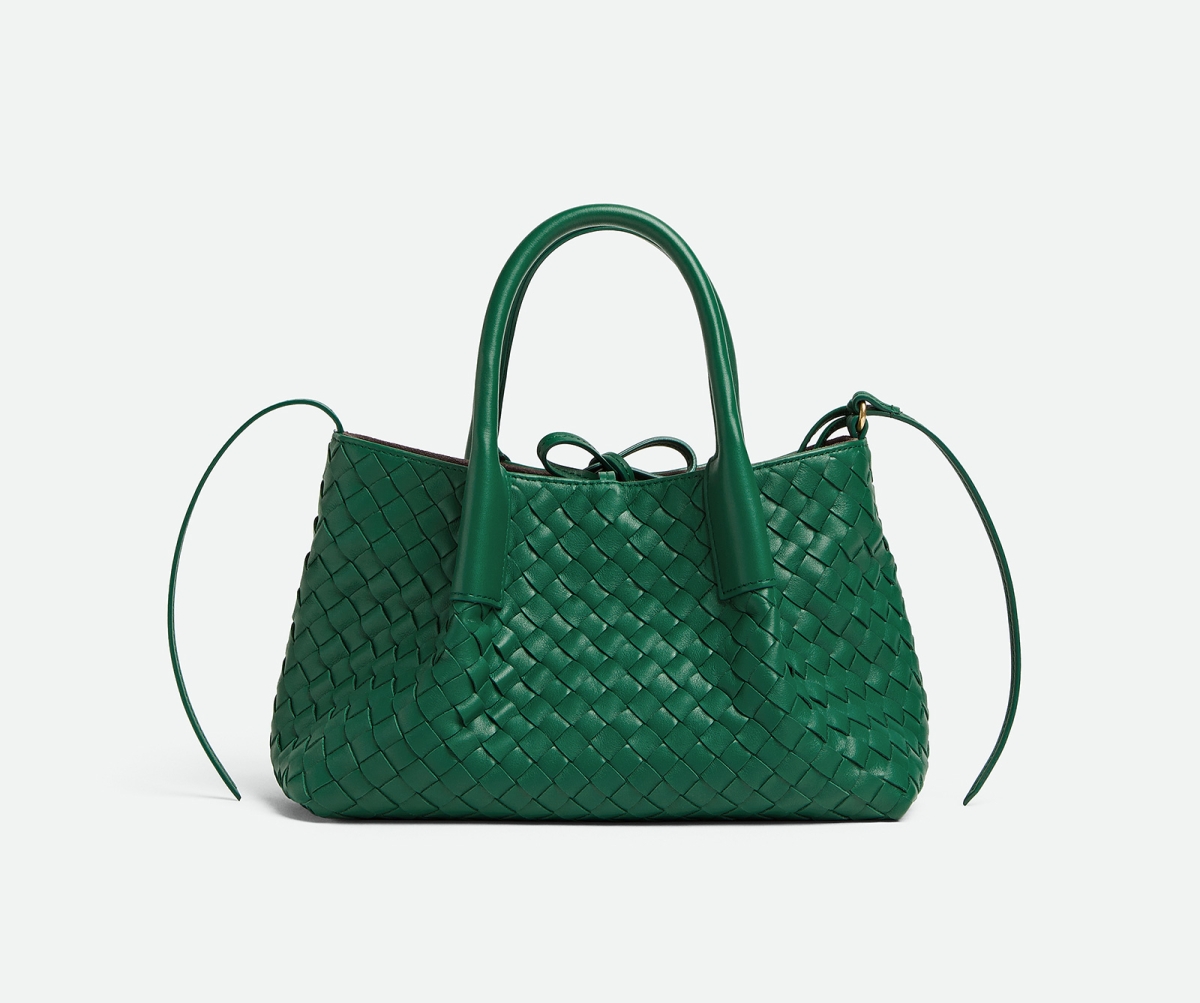 鮮やかなグリーンが目を引くこのバッグは、ブランドのアイコン「カバ」を継承しつつ、10mm幅のイントレチャートを採用。繊細でフェミニンな表情を演出しながらも、機能性は抜群。ハンドル部分は職人の手仕事で丁寧に形作られ、イントレチャートに自然なシワを加えることでクラフトマンシップの美しさを際立たせている。さらにレザーバンドは、外側に垂らしてアクセントにしたり、バッグのフォルムを変えたり、しっかり閉じる用途にも使える万能仕様。