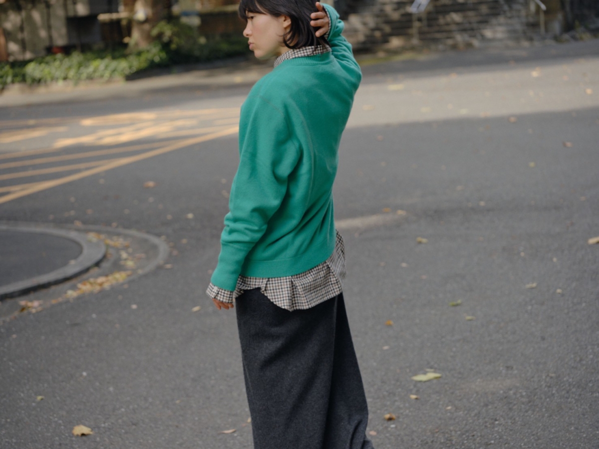 今回登場した新作は、どちらも“カシミヤでやりたかった日常着”を形にした2アイテム。ひとつめは、スウェットをそのままカシミヤで表現したようなクルーネック。襟元のガゼットや裏側のループまで再現されていて、見た目は完全にスウェットなのに、着心地はふわっと軽くてあたたかいカシミヤというギャップが楽しい一枚。