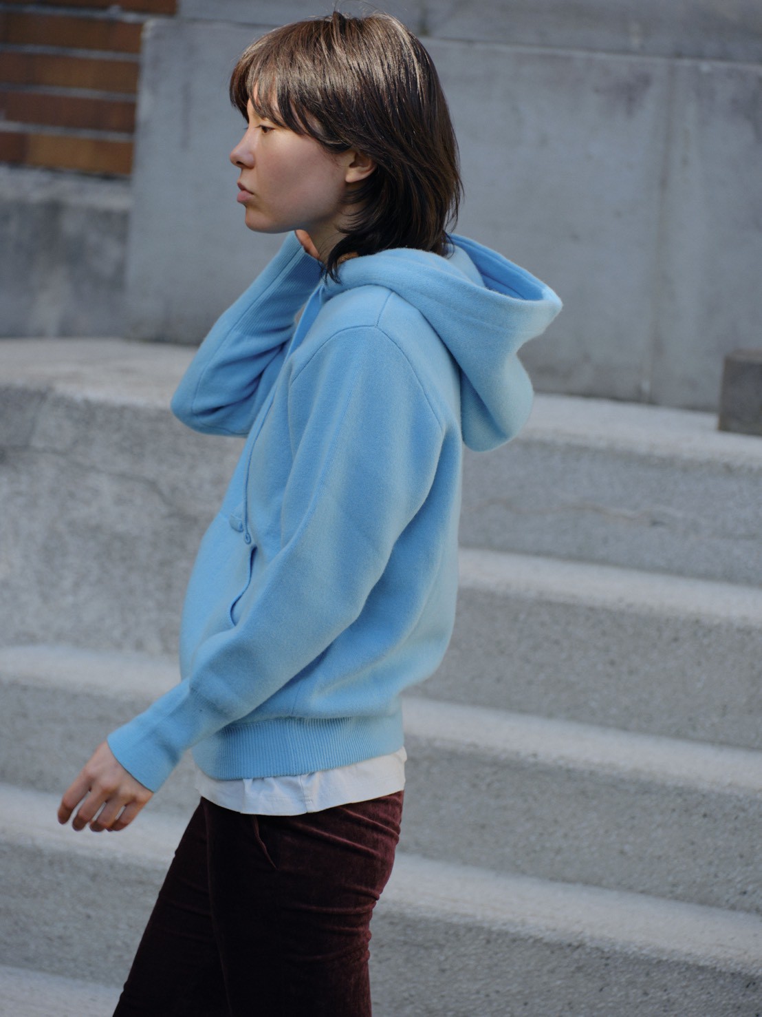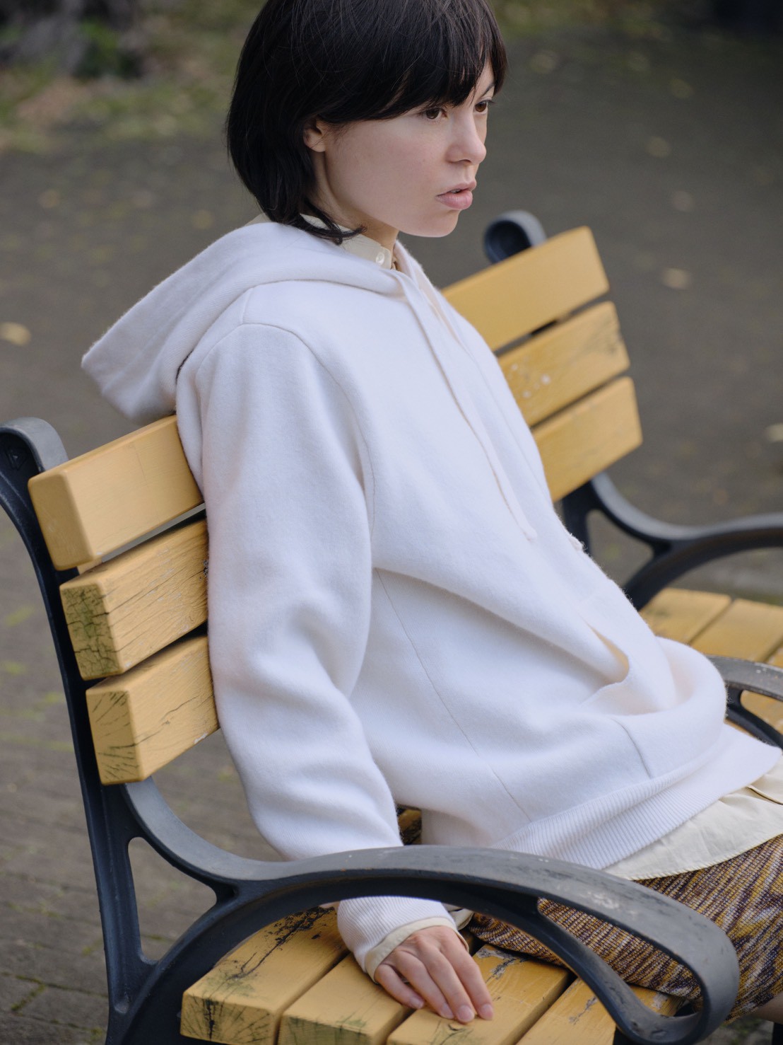 もうひとつは、カシミヤを二重編みにしてあえて“重さ”を出したプルオーバーパーカ。カシミヤなのにしっかり厚みがあって、アウターいらずの暖かさ。重厚感があるのにとろっと柔らかい、不思議な着心地がクセになるはず。