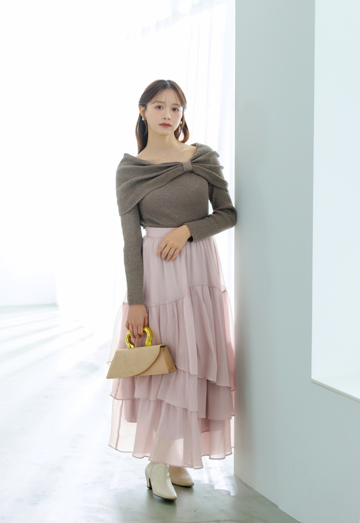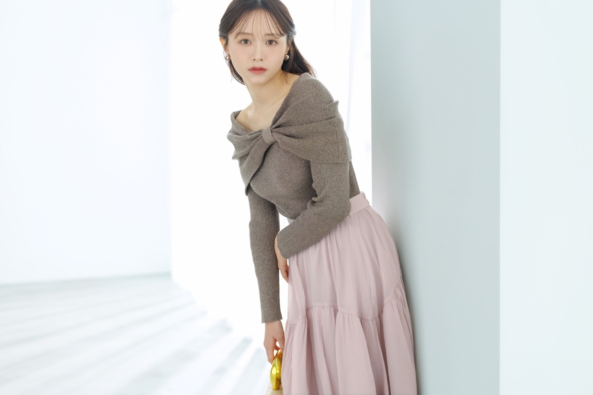 これからのシーズンに大活躍してくれる、繊細なラメがあしらわれたニットトップス。大きなリボンをまとったようなオフショルダーは、小顔効果&品良くデコルテを強調する絶妙なデザインで適度に甘さをセーブ。二の腕まわりをさりげなくカバーしながら、上半身を華奢に見せてくれるのも注目ポイント。