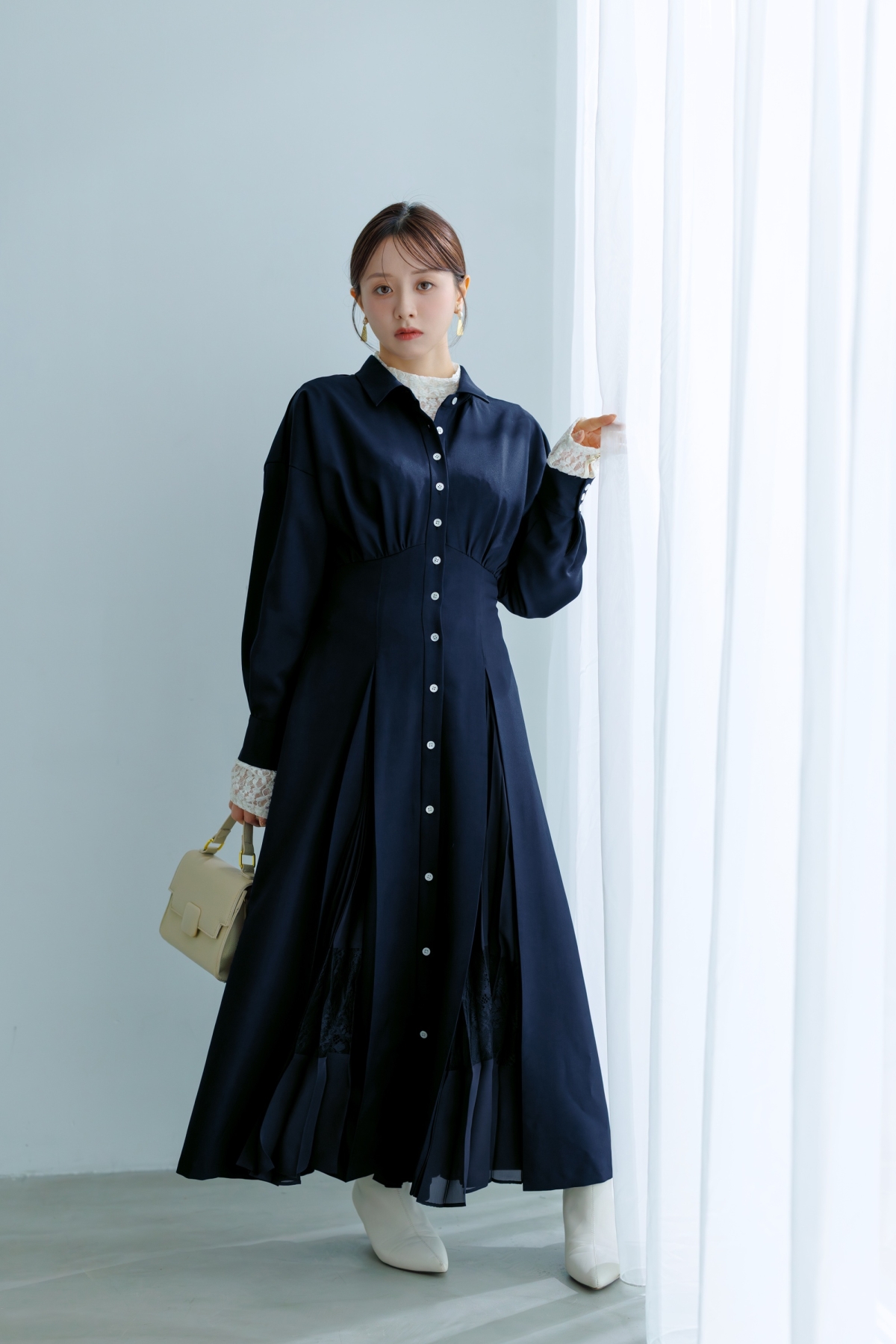 シャツ衿のきちんと感、フロントに並んだ縦ラインを強調するボタンデザイン、動くたびに揺れるスカートからのぞく異素材プリーツにはこっそりとレースが仕込まれていたりと、語りどころが満載。胸下の切り替えデザイン、バックサイドのゴム使い&リボンがシルエットにニュアンスを加え、スタイルアップも叶えてくれる。インにレーストップスを合わせたり、アレンジ次第で着こなし幅が広がるのも魅力!