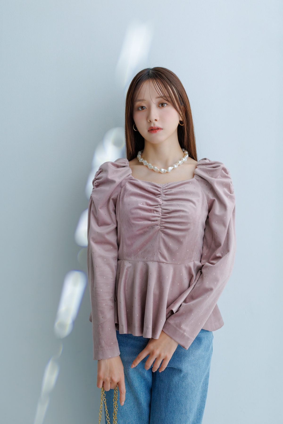 胸元のシャーリング、ふんわりスリーブ、ペプラムデザインの裾など、上半身のシルエットを美しく演出してくれるベロアトップス。手持ちのボトムスに合わせるだけで、いつものコーデが”よそ行き顔"にシフトする主役級の存在感。