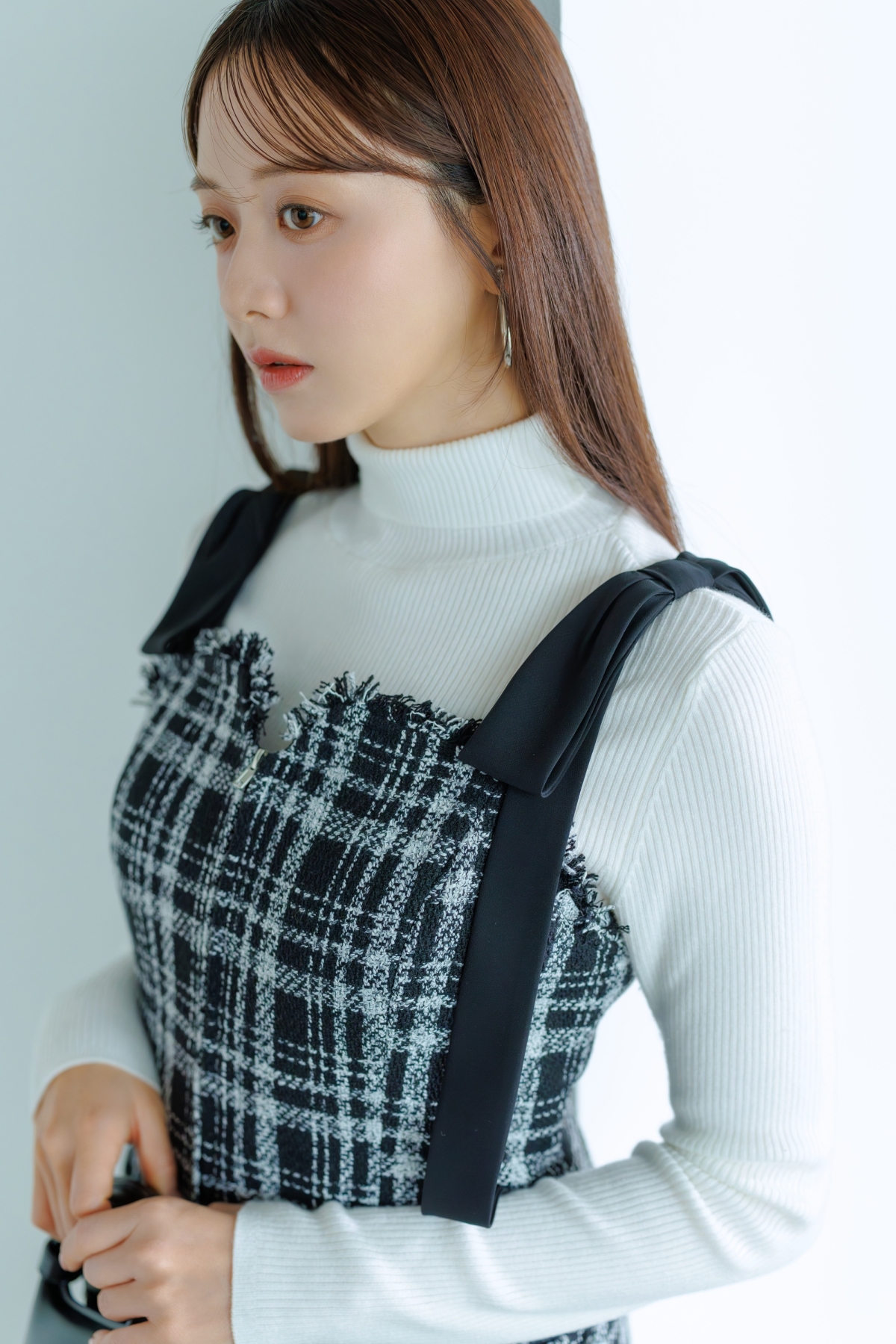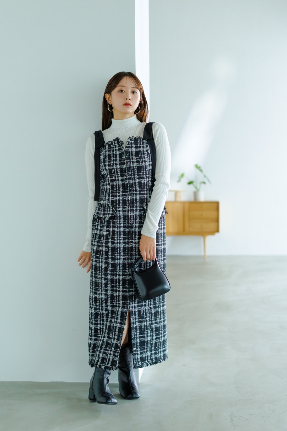 ツイードといえばジャケットが定番だけど、ワンピのラクしてセンスがよく見えるこの洒落感は見逃せない。合わせるインナーや小物で、着こなしバリエを楽しんで。