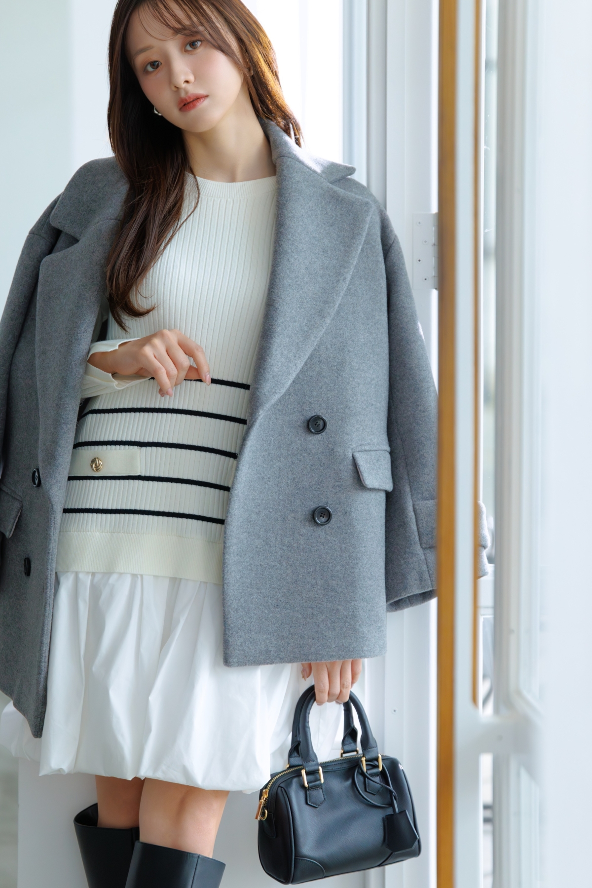ボーダーがアクセントになったニットトップス+ふんわりシルエットのスカートをドッキングさせた技ありワンピース。カジュアルもエレガントも巧みに取り込んだバランスが、狙いすぎない大人の可愛いを生み出してくれる。金ボタン付きのポケットも今っぽいアクセントに。このワンピがあれば、テクニック要らずでスタイリッシュな初冬コーデが完成!