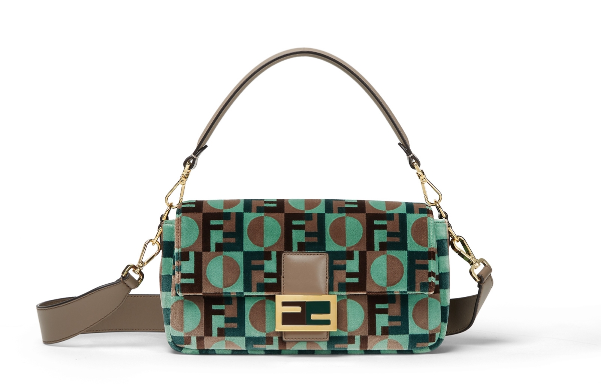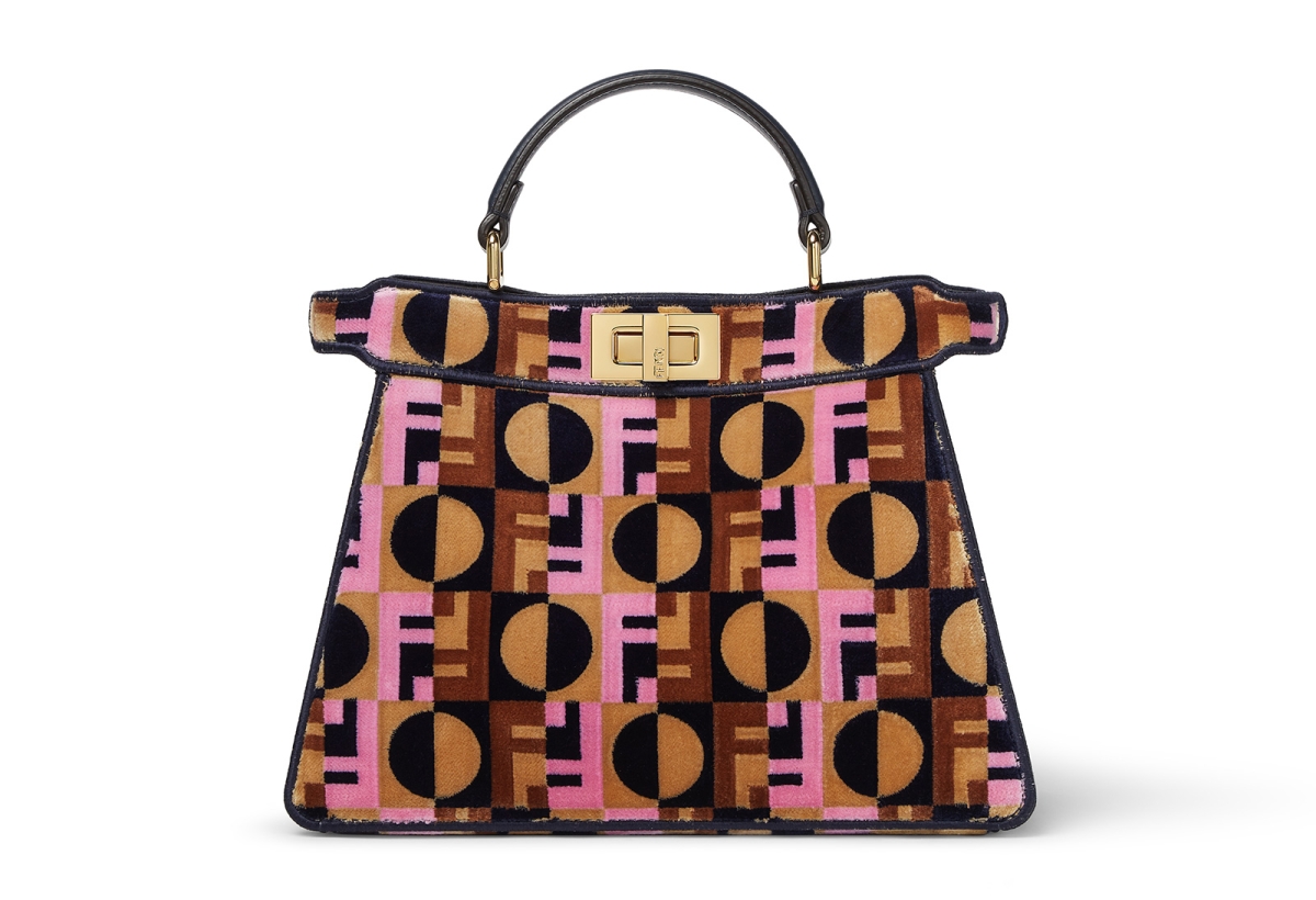 本コレクションの主役となるのは、ブランドの象徴「バゲット(Baguette)」2型と「ピーカブー(Peekaboo)」1型。アイコニックな「FF」ロゴにアールデコ調の水玉を融合させた新モチーフ「FENDI Dots(フェンディ ドット)」が、遊び心とエレガンスを同時に演出する。タペストリーのような奥行きを持つ生地に、ブラウン×ピンク、ダブ×ミントグリーンといった柔らかくも印象的なカラーが映え、ドラマの軽快なテンションを思わせる仕上がりに。