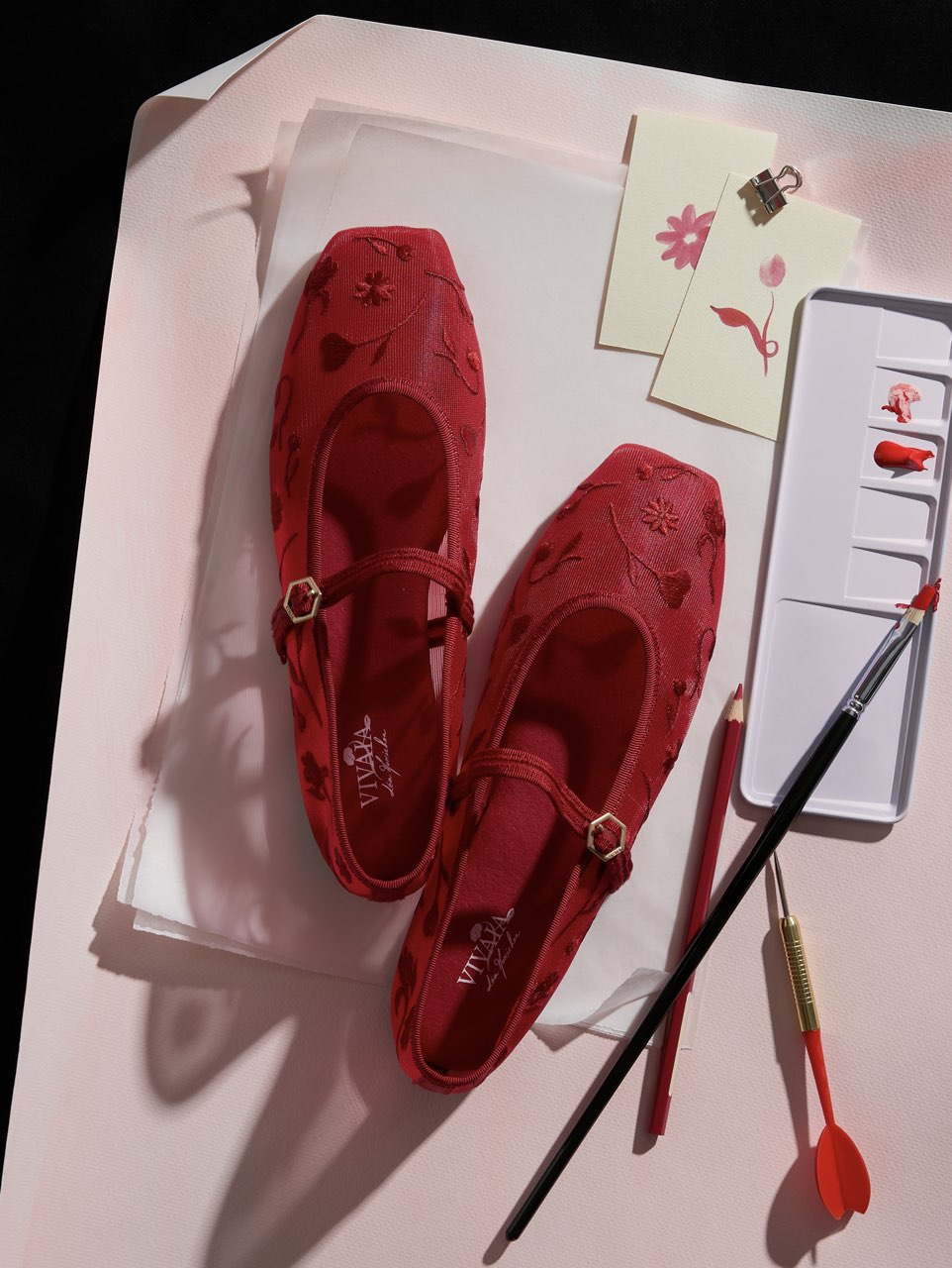 ベースとなるのは、ビバイアの人気モデル「Margot Mary-Jane」。モリションが描く“温もり”や“陽の光”、そして穏やかな心の揺らぎを重ね合わせ、まるでアートをそのまま足元にまとうような一足へと再構築。肌がほんのり透けるセンシュアルなメッシュ素材に、深紅のフラワー刺繍が咲くデザインは、ロマンティックで乙女心がくすぐられる!