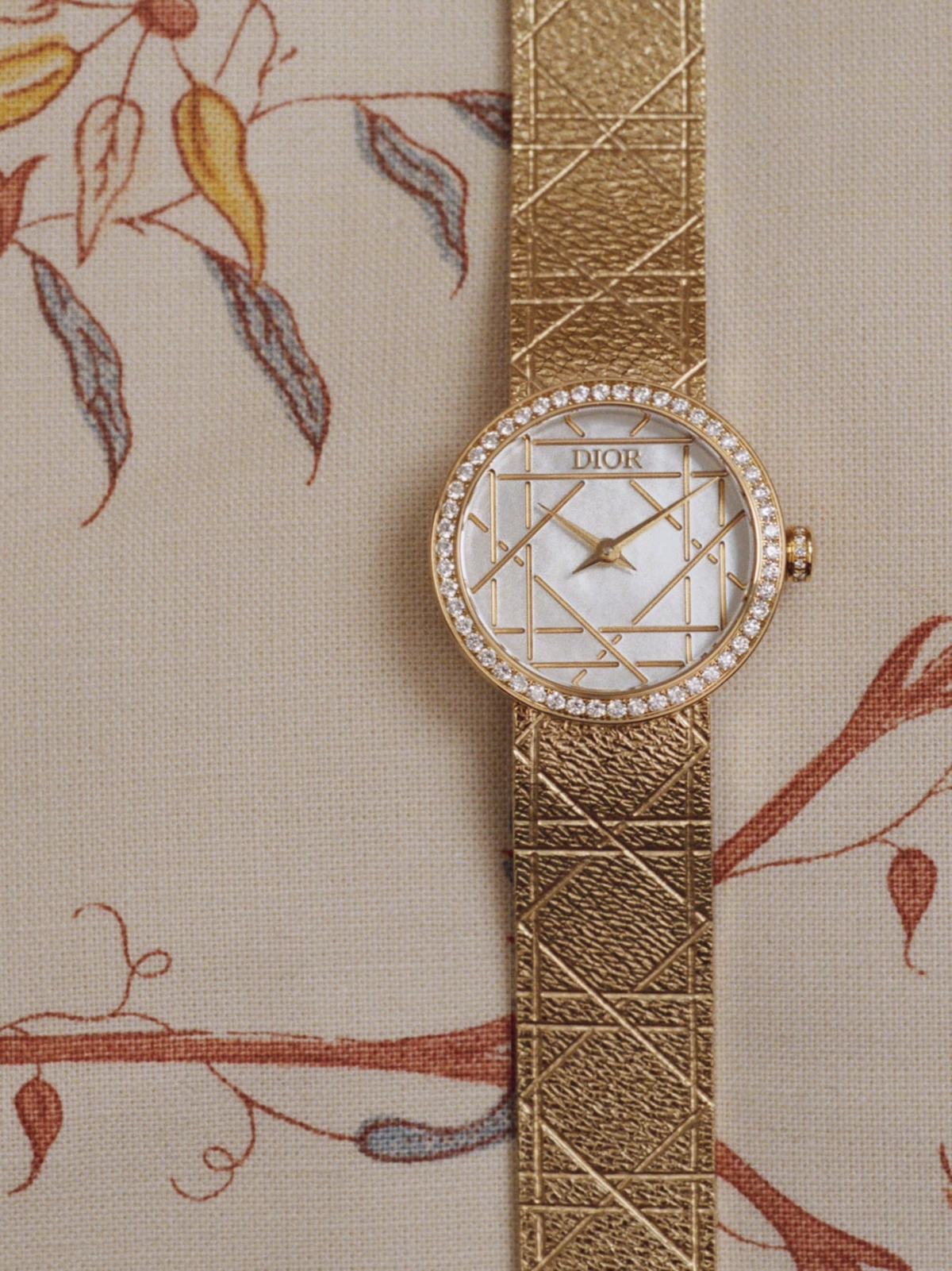 今回登場したのは、「ラ デ マイ ディオール」の最新モデル。ディオールの定番コード“カナージュ”をまとい、ゴールドやスティール、ダイヤモンドが織りなすグラフィカルなデザインがとにかくモダン。クラフツマンシップの細やかさと、ジュエリーの華やぎが絶妙に溶け合っている。