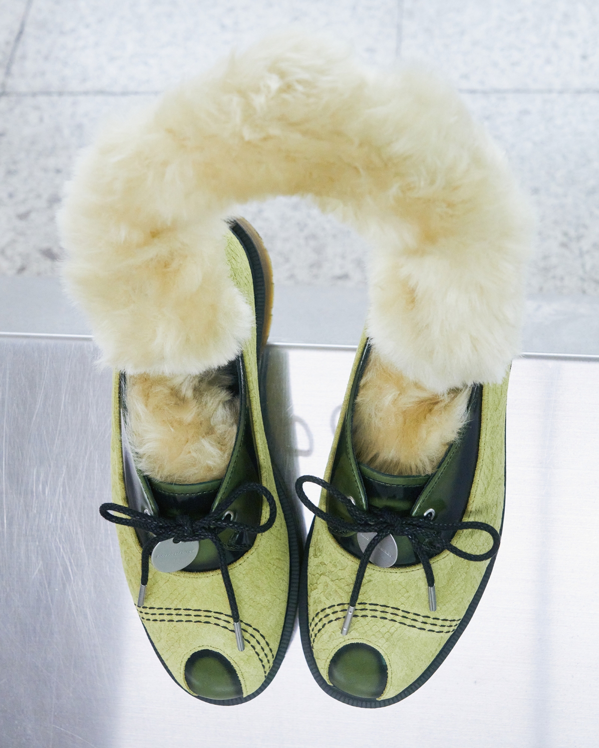 ウィメンズの「TOE BOX Shoe」は、シングルアイレットのレースアップが新鮮。シャルトリューズのエンボススエードと2トーンのグリーンレザーを組み合わせたアッパーが目を引き、オックスフォードとメリージェーンをミックスしたようなハイブリッドなシルエットにときめく。また、カットアウトのディテールやトリプルステッチ、ドッグタグなど、細部まで遊び心が詰まっている一足に。