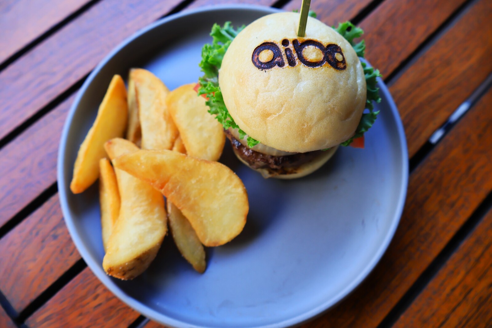 aiboのおやつをモチーフにした「aiboのハンバーガー」。シャキシャキの野菜とジューシーな肉の美味しさが楽しめる、ミニサイズながら満足度の高いハンバーガー。