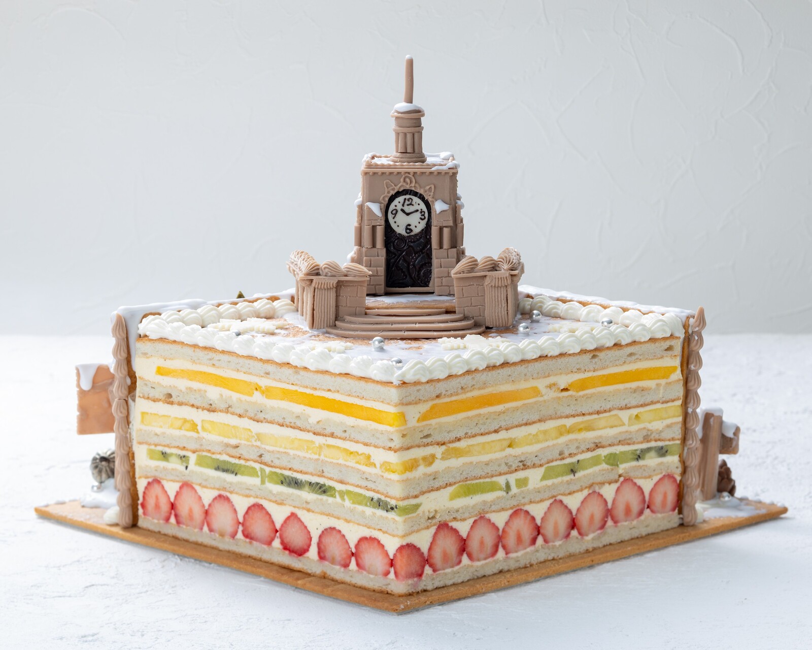 銀座の象徴・セイコーハウスをかたどった立体的なケーキ「Noël de WAKO」は、一度は手にしてみたいと思うお菓子の家をとびっきり豪華に表現した新作ケーキ。ドイツのお菓子の家(ヘクセンハウス)をイメージして完成した「Noël de WAKO」は、土台から時計塔の先までどのパーツも食べられるスイートハウスです。