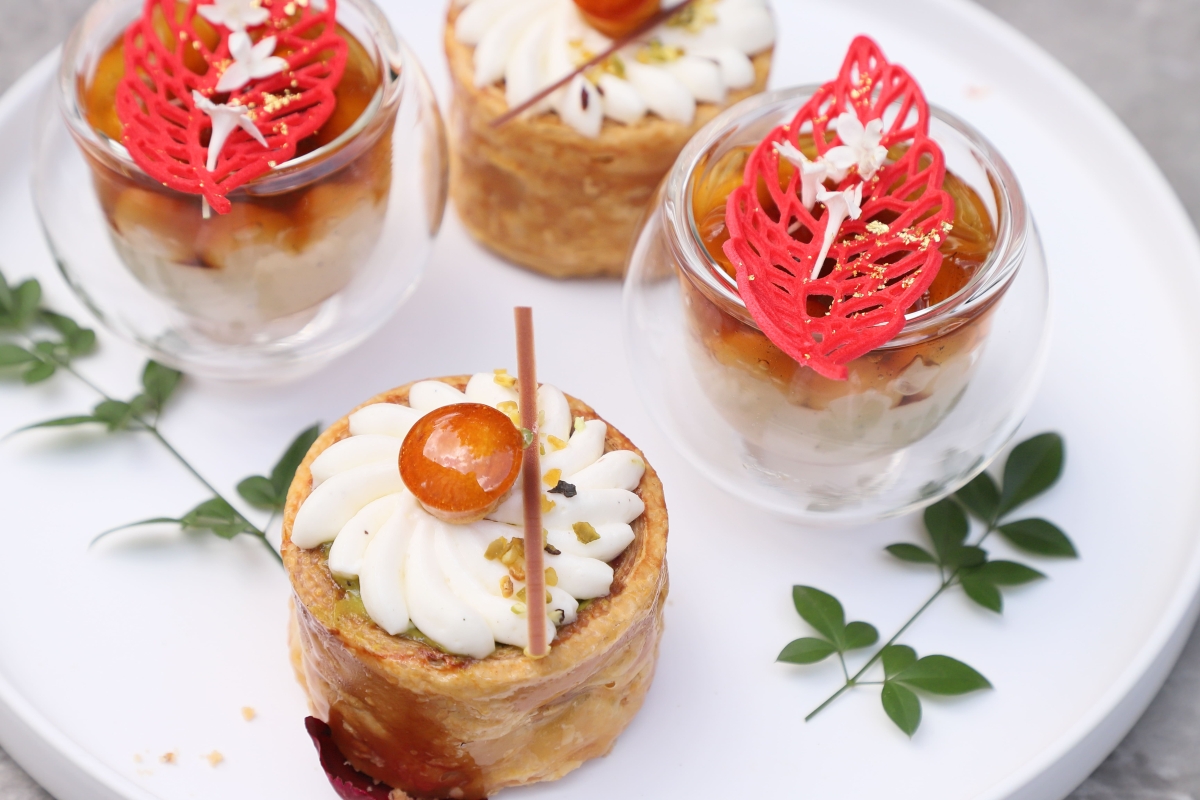 スイーツはシャインマスカットや柿、栗、洋ナシ、リンゴといった季節の果物の香りや味わいを凝縮。滑らかな舌触りやフレッシュ感、瑞々しさが口に入れた瞬間に広がり、美味しさの余韻が続く。