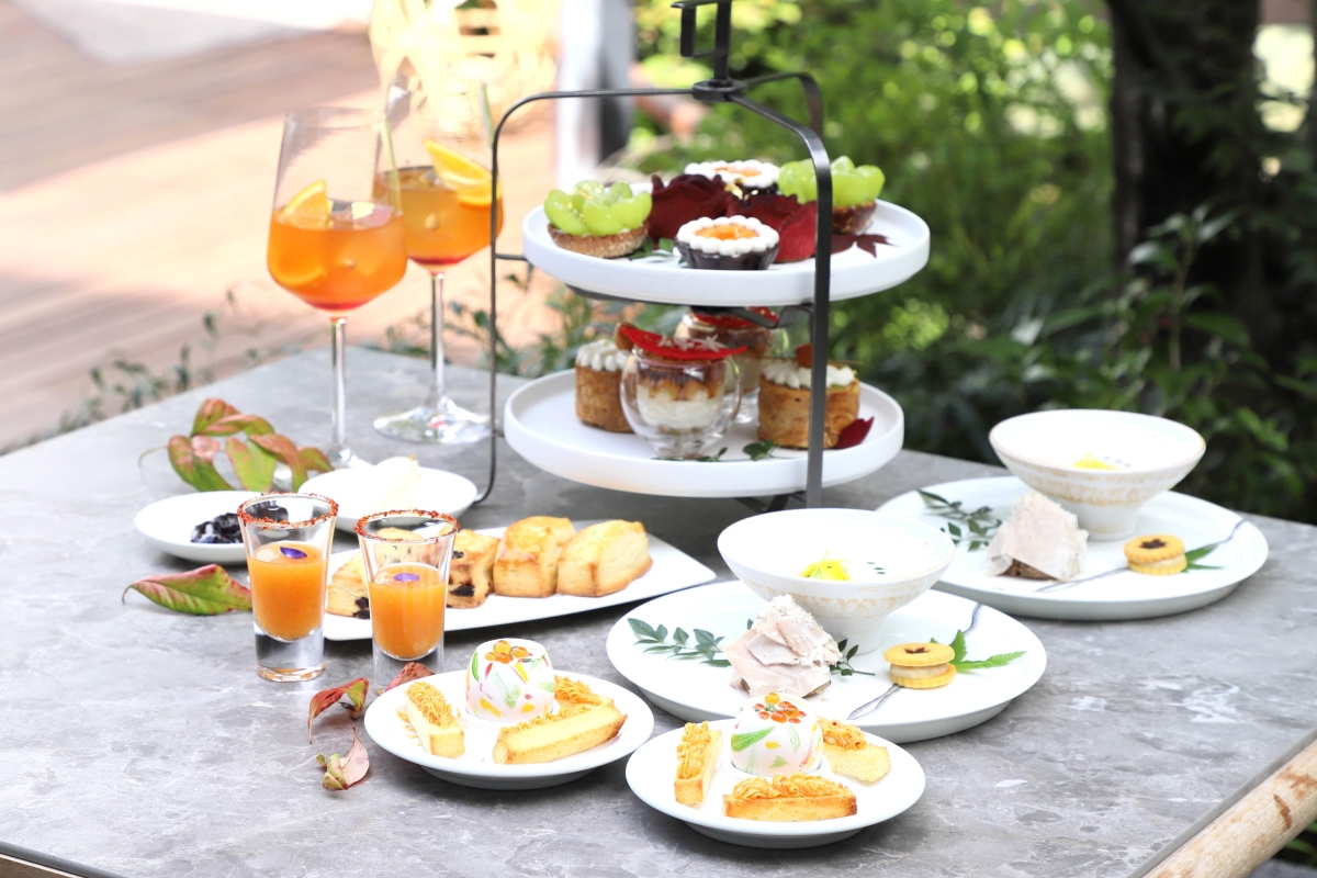 テラス席は庭園を臨むという好ロケーション。フォーシーズンズホテル京都で開催中のアフタヌーンティーは、秋色に染まる景色を愛でながら、秋の味覚満載の極上のアフタヌーンティーがいただけると話題だ。(ライター/和多亜希)
