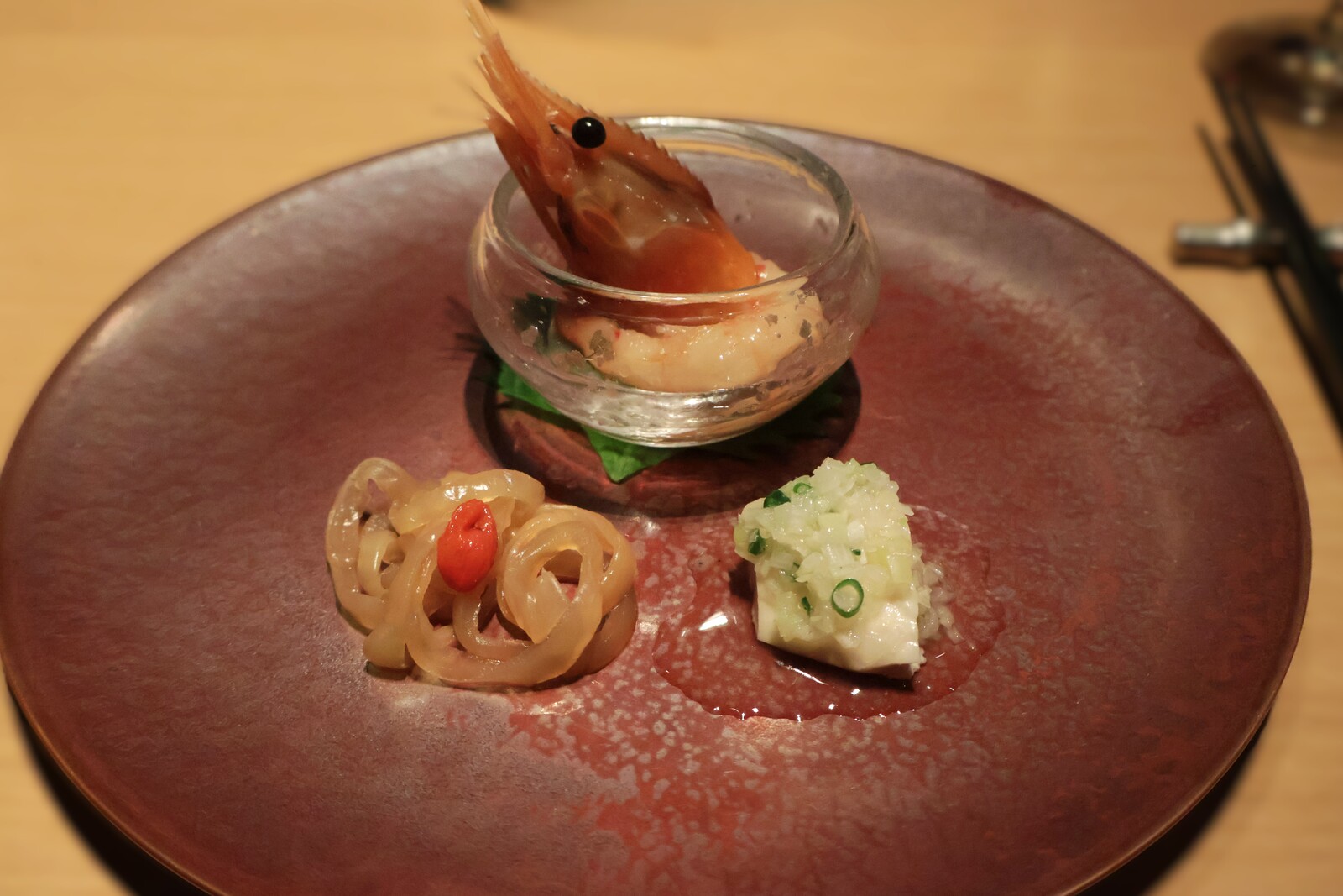 前菜3種盛り合わせ「ボタン海老の紹興酒漬け、蒸し鶏の葱ソース、冷製クラゲ」