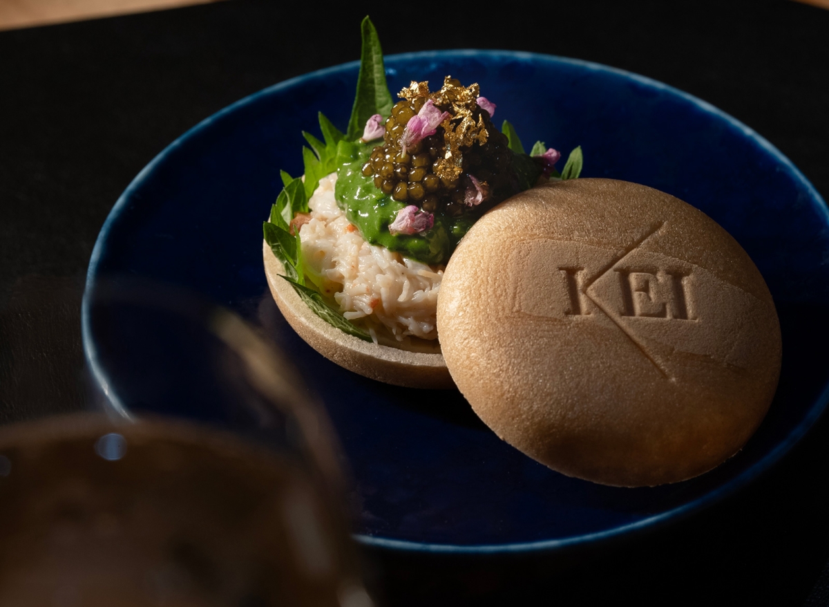 KEI Collection PARISのシグネチャーである「最中」に、小林シェフが監修したKaviari社製「KEI セレクション」のオリジナルキャビアを贅沢に合わせた、特別な一品。冬の味覚として名高い兵庫県産香住蟹の濃厚な甘みと旨みに、クリーミィーでリッチなキャビアの風味が重なり合い、口のなかで繊細かつ力強いマリアージュを奏でる。