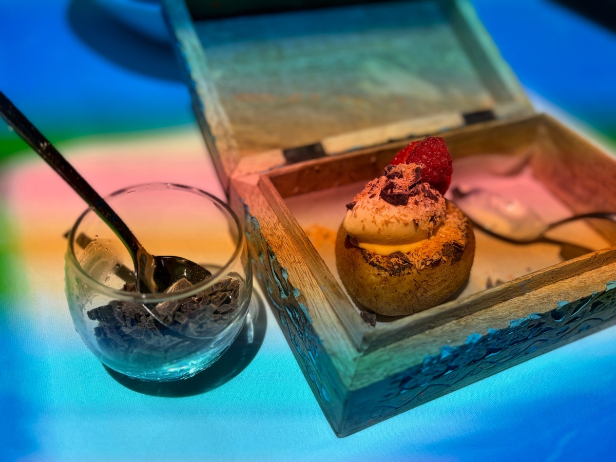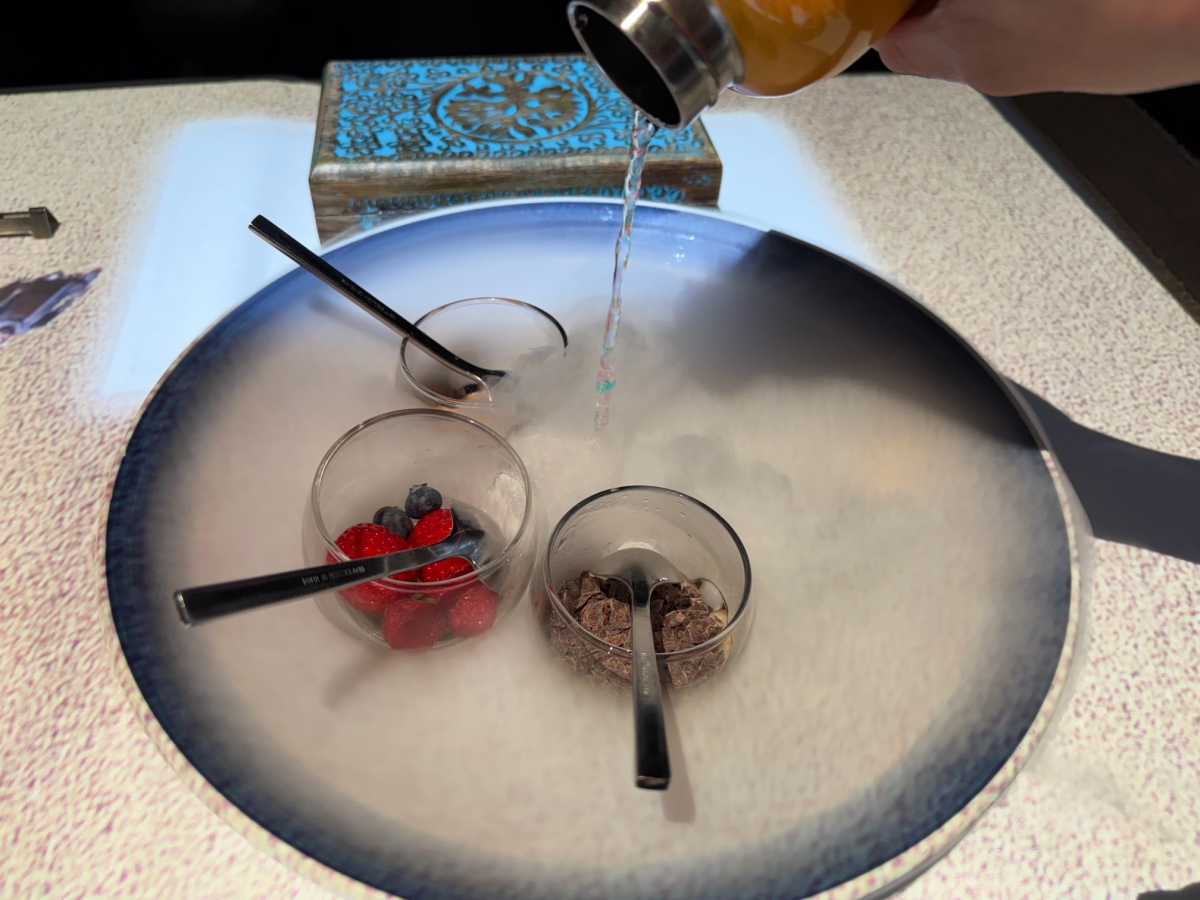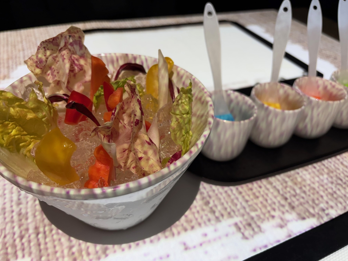 アミューズをいただくためにダヴィンチコードを探したり、様々な色の野菜のピューレをデザインしてサラダをいただいたり、試験管や瓶に入ったソースで料理を仕上げたりと、さまざまな体験ができるのもこのディナーならでは。いかにクリエイティビティを高められるか? アーティスト気分で臨みたい。