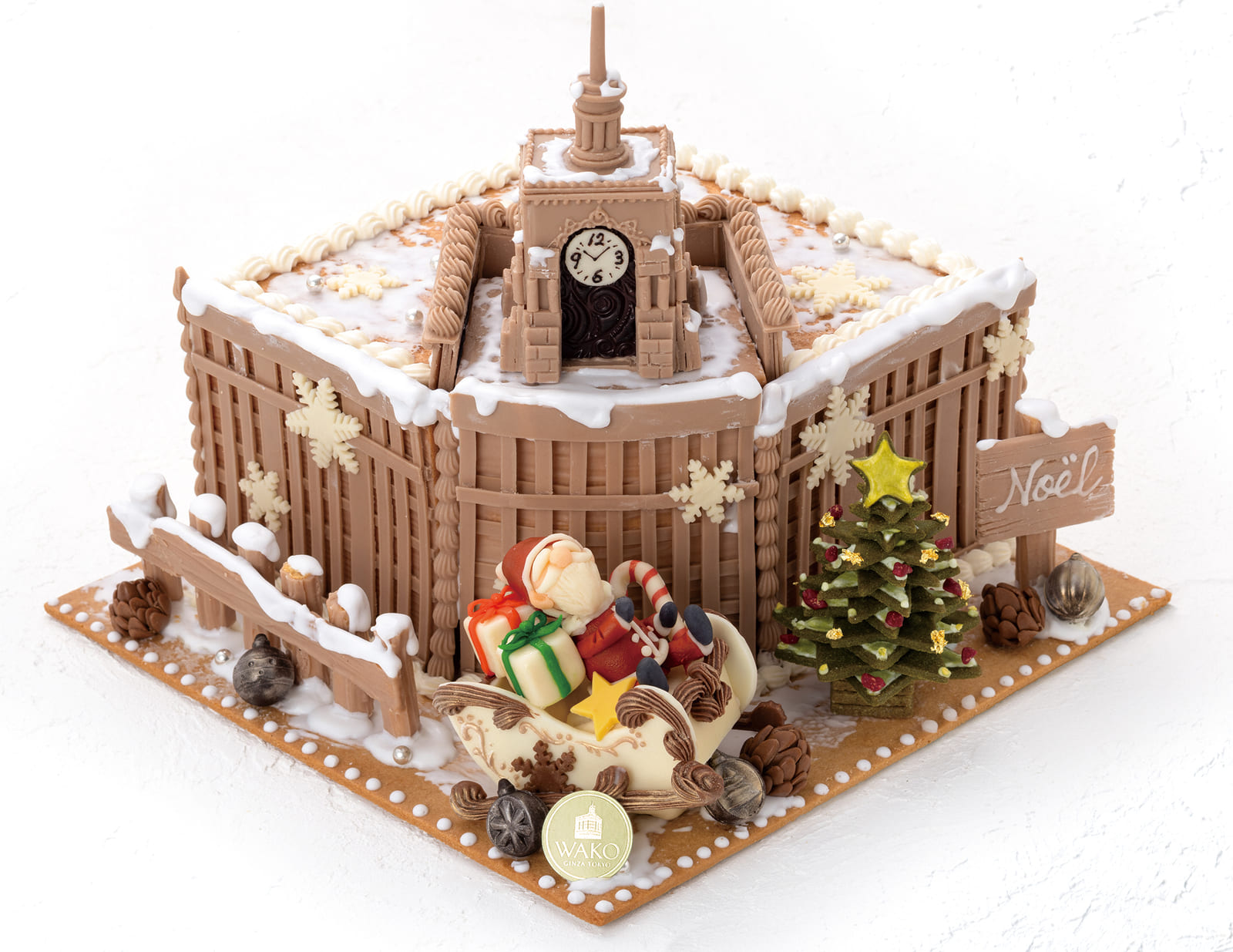 銀座の象徴・セイコーハウスをかたどった立体的なケーキ「Noël de WAKO」は、一度は手にしてみたいと思うお菓子の家をとびっきり豪華に表現した新作ケーキ。ドイツのお菓子の家(ヘクセンハウス)をイメージして完成した「Noël de WAKO」は、土台から時計塔の先までどのパーツも食べられるスイートハウスです。
