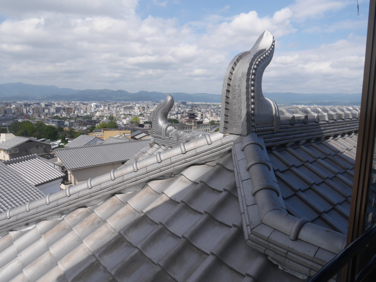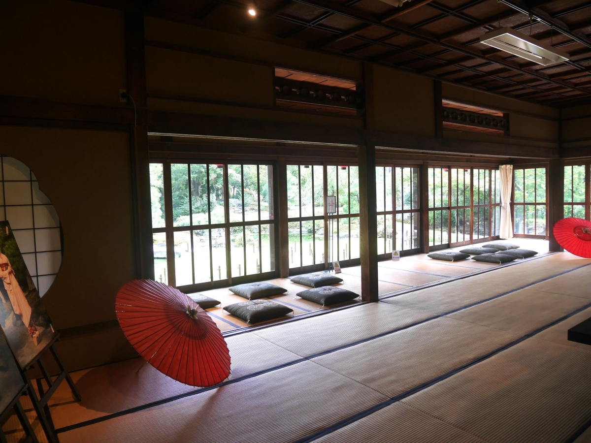 京都の東山の街中に突如出現するハイカラな建物。大正10年(1921年)に製陶業を営む松風嘉定の邸宅として、「関西近代建築の父」と称される武田五一が手がけた。当時は和館と対で建てられたが、現在は洋館のみが残る。瓦屋根や屋根飾りの鴟尾(しび)、格子状(日本古来の伝統的模様)デザインなども組み込まれ、日本の文化との融合作品といえる。和と洋の巧みな混ざり合いをじっくり鑑賞したい。
