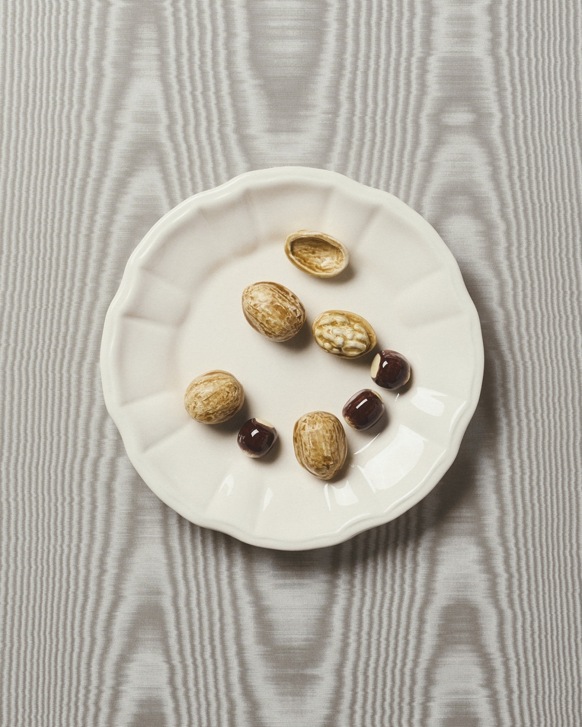 卵、クロワッサン、ナッツ、アスパラガス、ストロベリータルトにチョコレートタルト、どれも本物と見間違うほどの完成度。ナッツなんてお皿の上にたくさんナッツを盛ったら、食べ尽くすとき陶器の一部を摘んじゃうひとがいますねきっと(笑)。モチーフの一部を上手に使って盛り付ければ、クリエイティブに見える美しいお料理が完成しそうです。